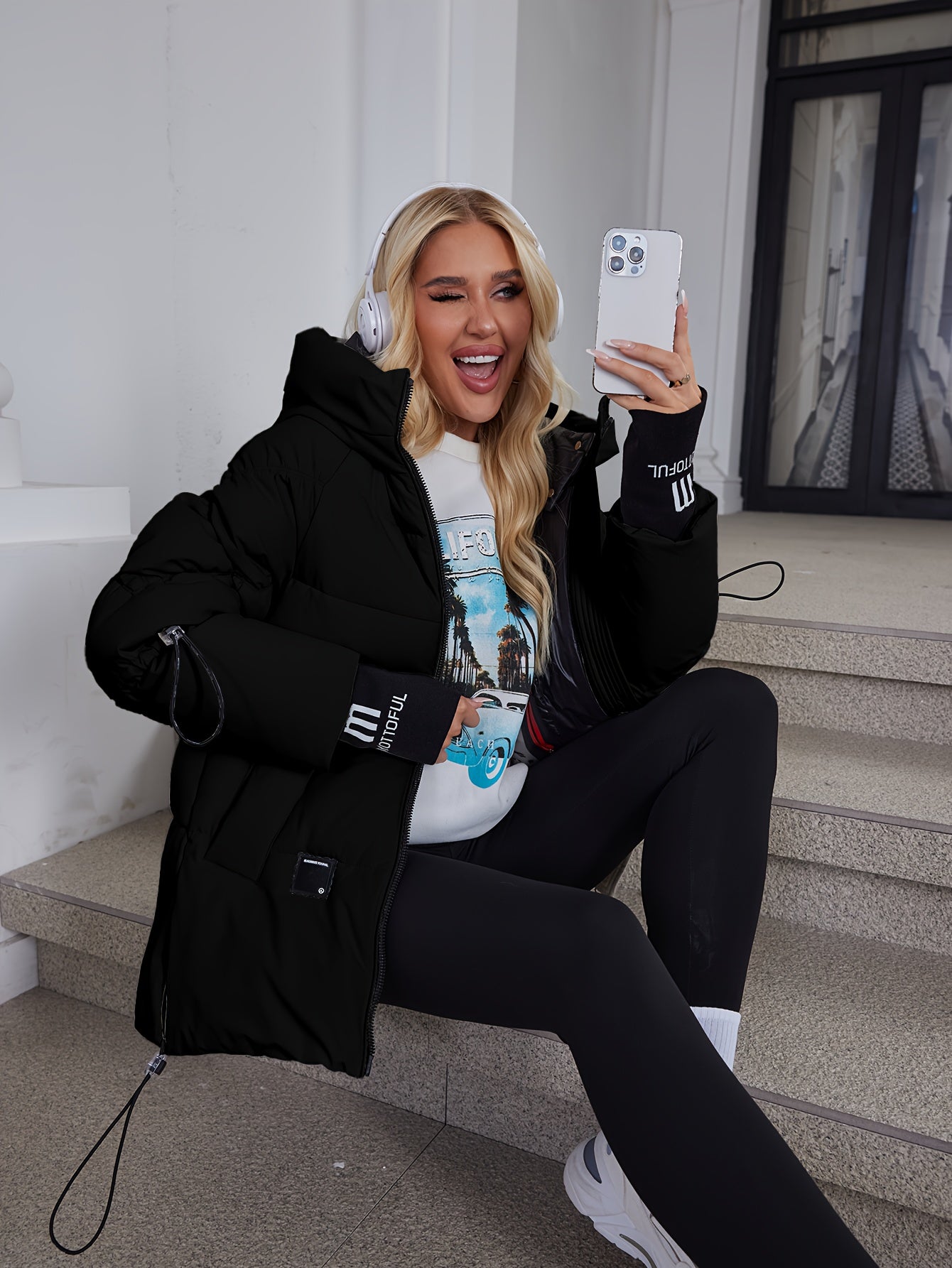 Կանացի ոճային բեժ գույնի փքված բաճկոն՝ առօրյա տաք ձմեռային վերարկու՝ սև եզրագծով, երկար թևքերով և կայծակաճարմանդով գլխարկով, պոլիեսթերային գործվածք՝ բացօթյա հարմարավետության համար։