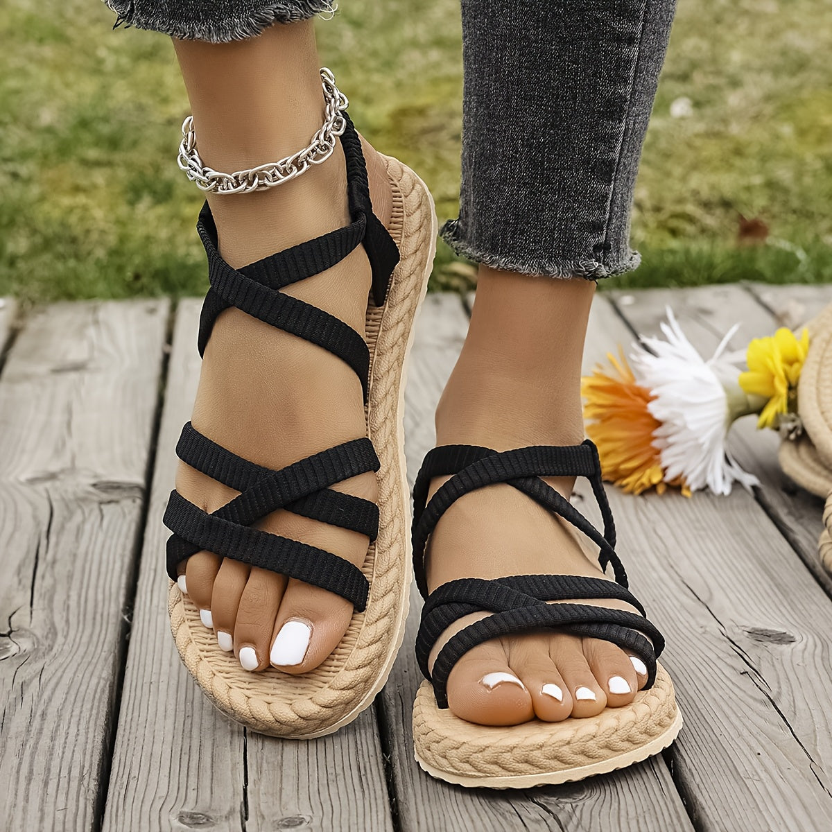 Կանացի ոճային սև հարթ սանդալներ՝ կարգավորվող կոճերի ամրակներով - շնչող գործվածքից վերին մաս, EVA ներբան, ցածր կրունկ՝ առօրյա հագուստի, լողափի և գարնանային զբոսանքների համար, ամրակներով սանդալներ