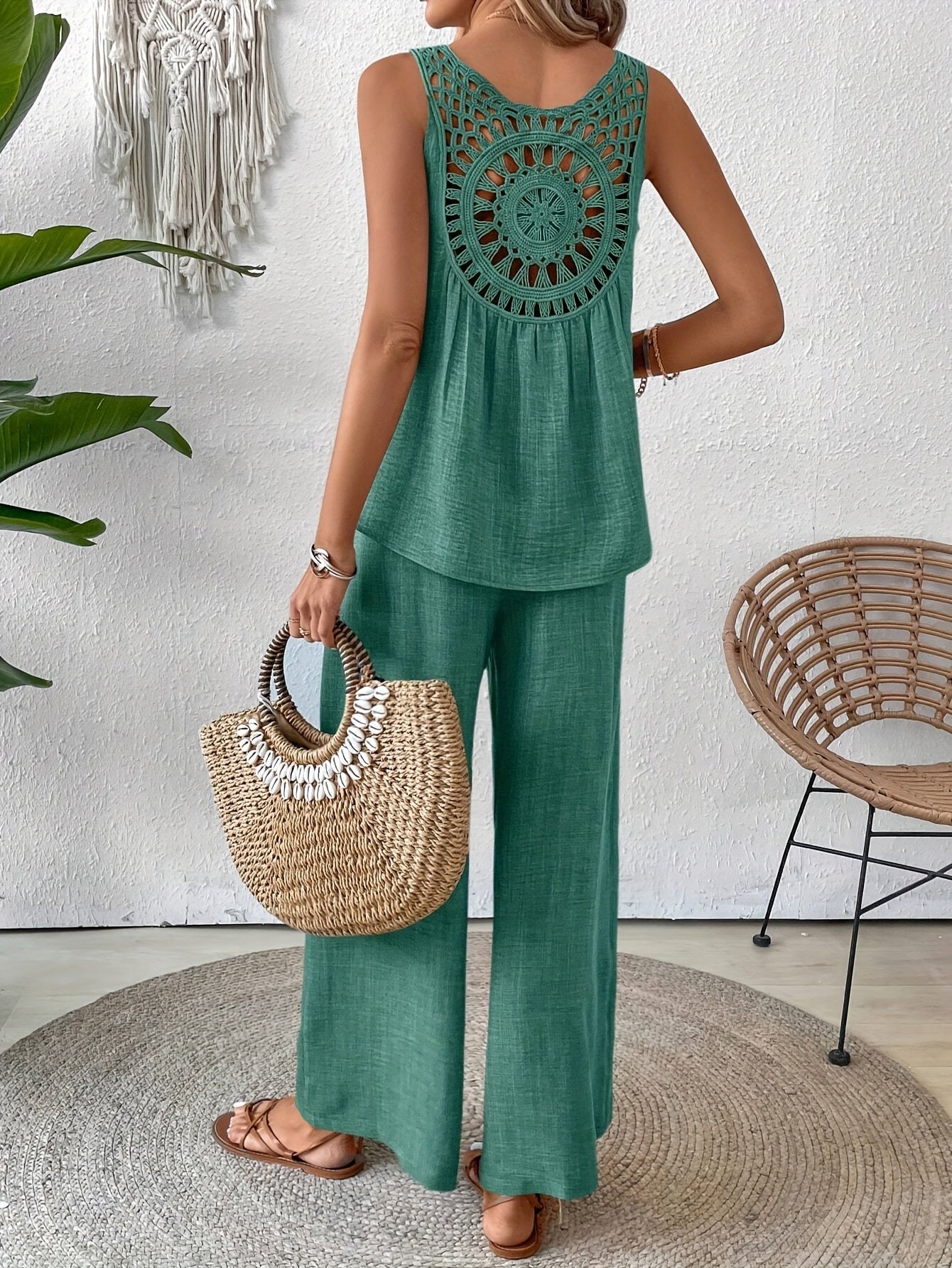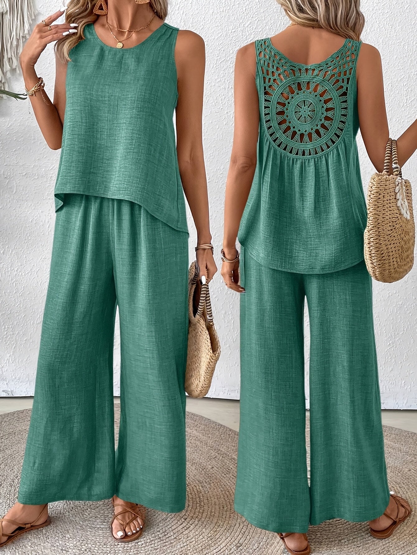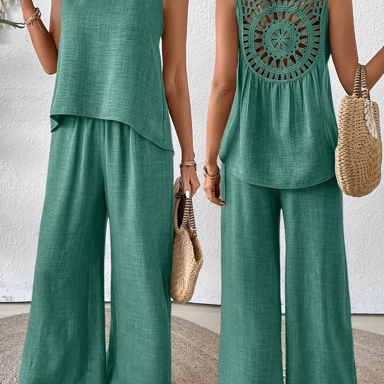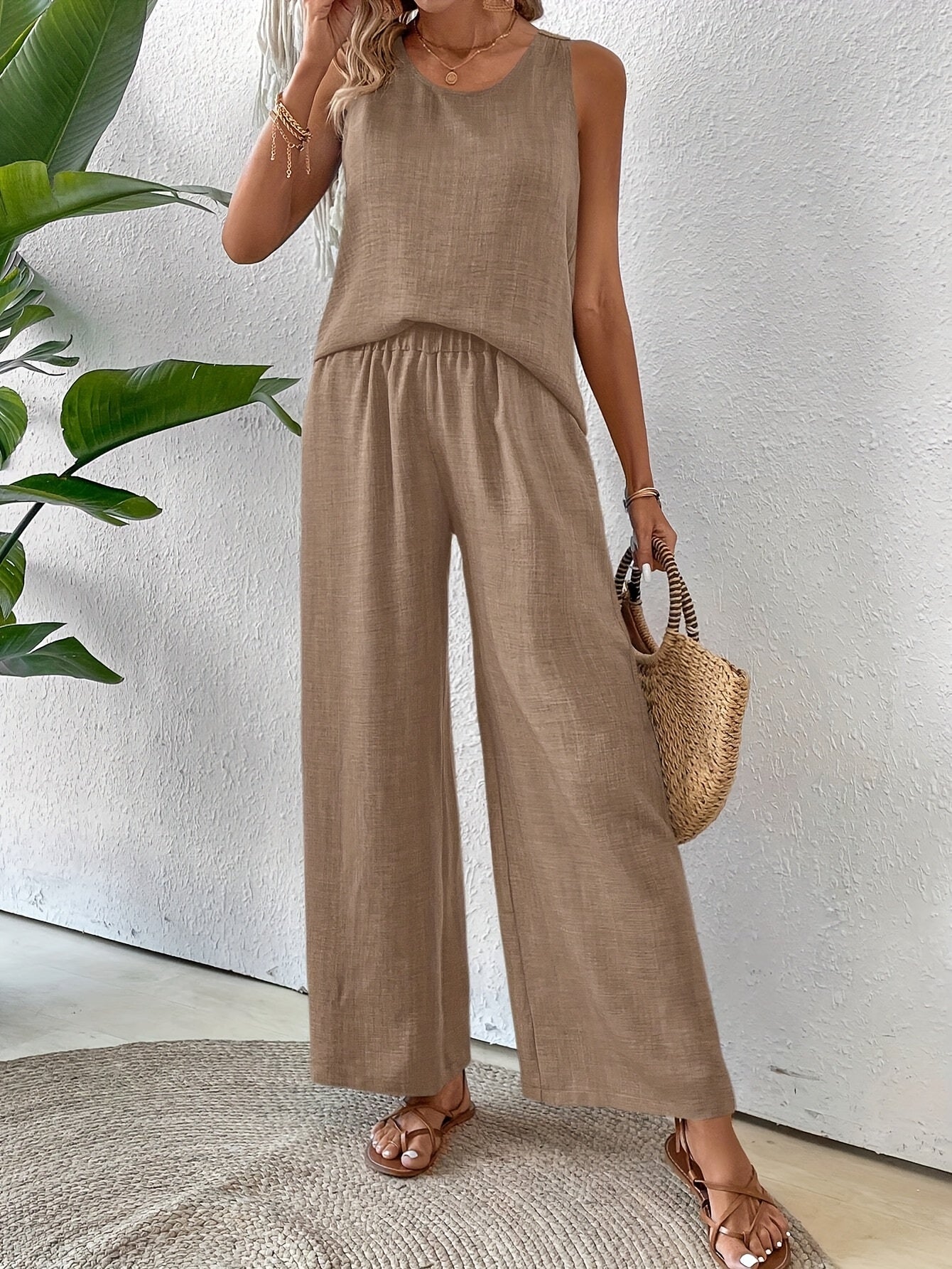 Կանացի ամառային բաց մեջքով կտրված մայկա-տոպ + լայն տաբատ - առօրյա, պարզ, անթև, պոլիեսթեր, բաց բեժ, իդեալական է գարուն/ամառ, առօրյա հագուստի համար | բաց մեջքով վերնաշապիկ | պոլիեսթերային գործվածք