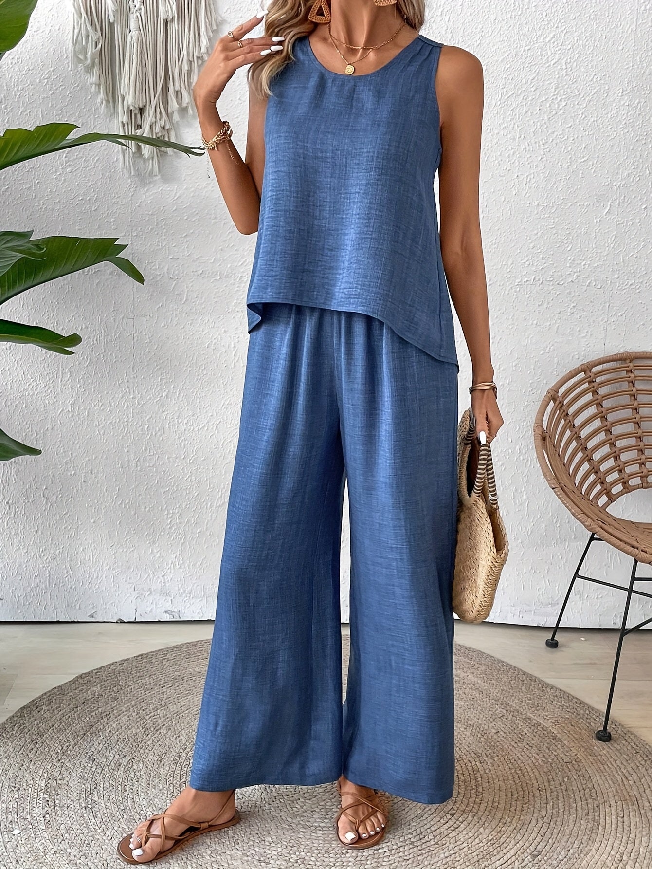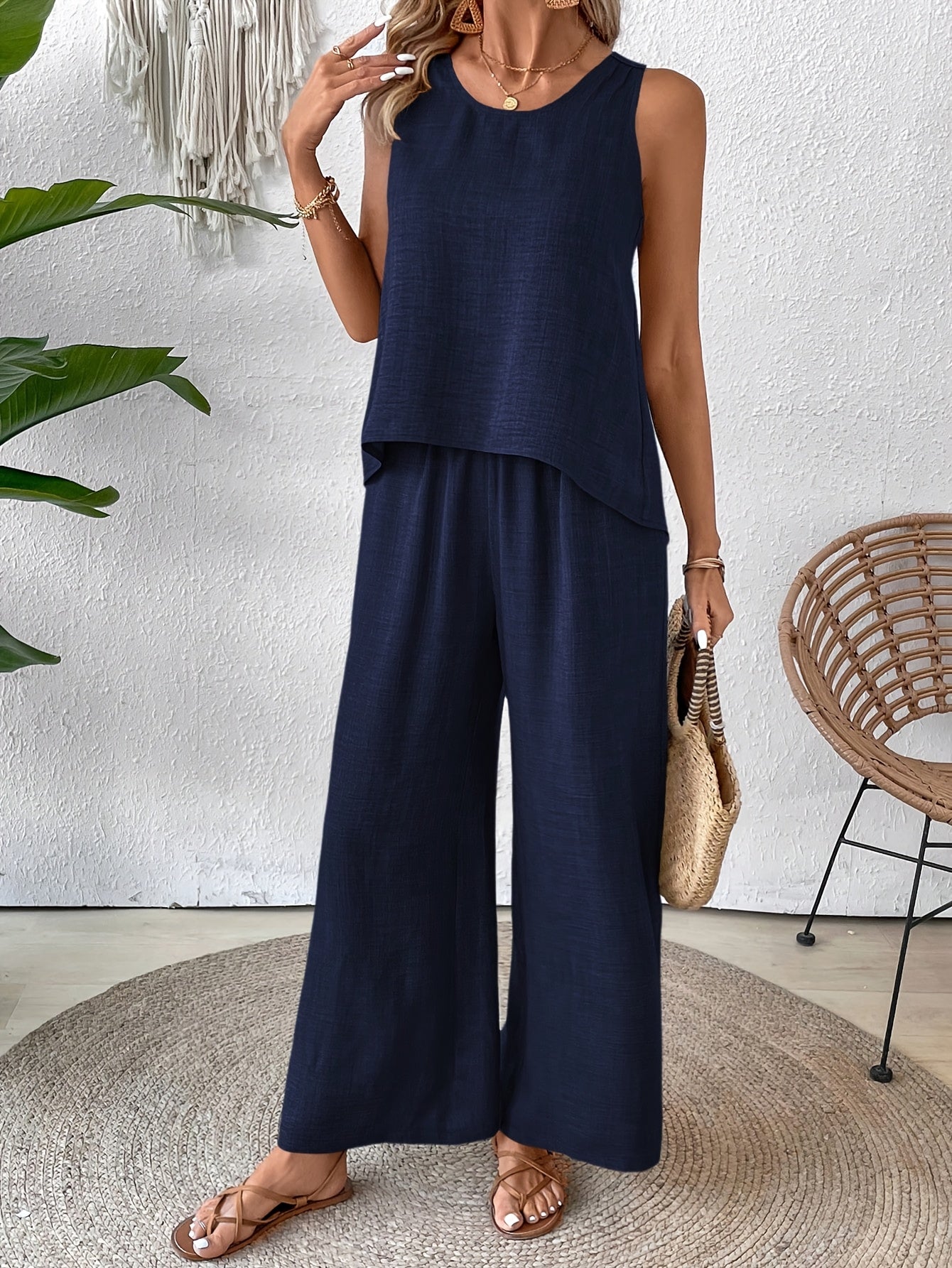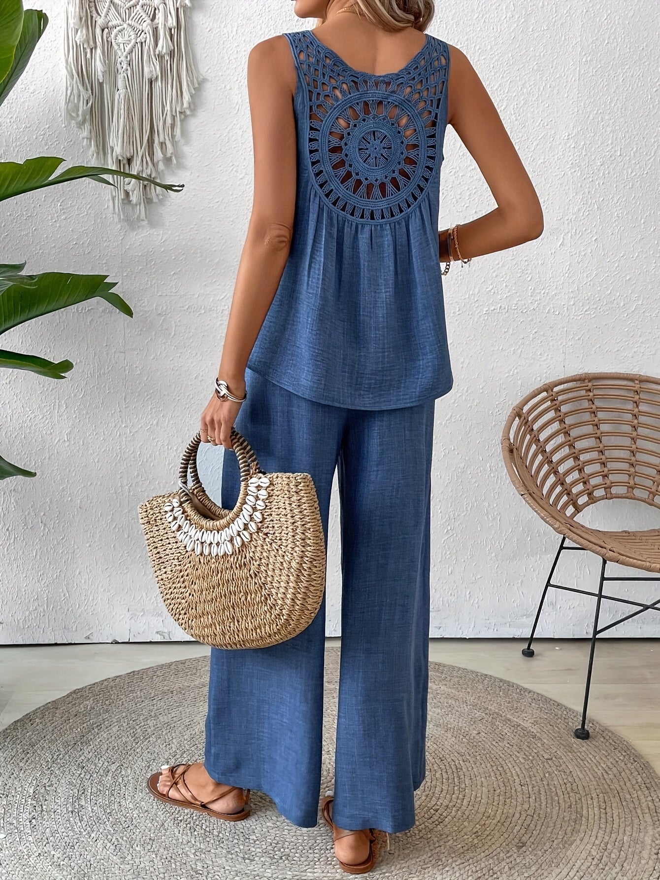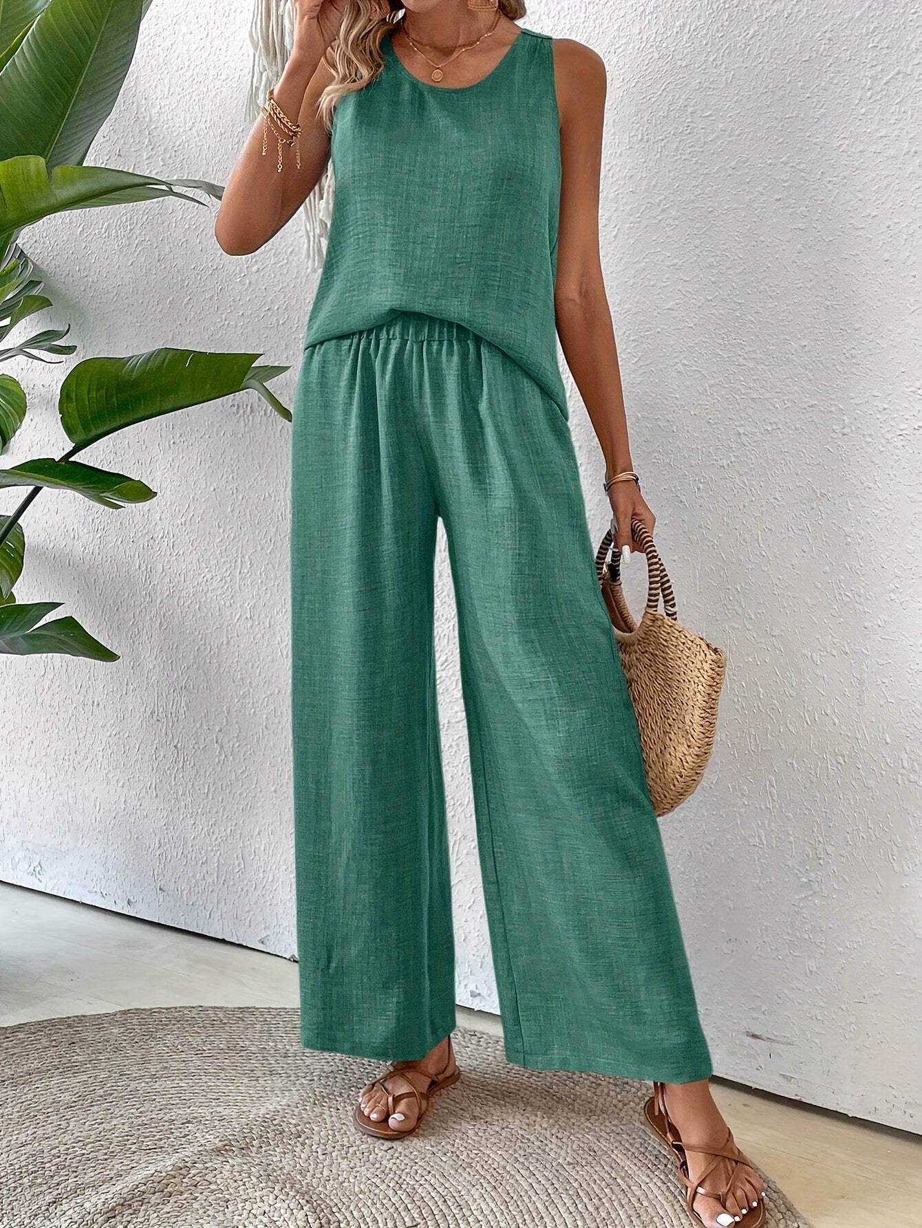 Կանացի ամառային բաց մեջքով կտրված մայկա-տոպ + լայն տաբատ - առօրյա, պարզ, անթև, պոլիեսթեր, բաց բեժ, իդեալական է գարուն/ամառ, առօրյա հագուստի համար | բաց մեջքով վերնաշապիկ | պոլիեսթերային գործվածք