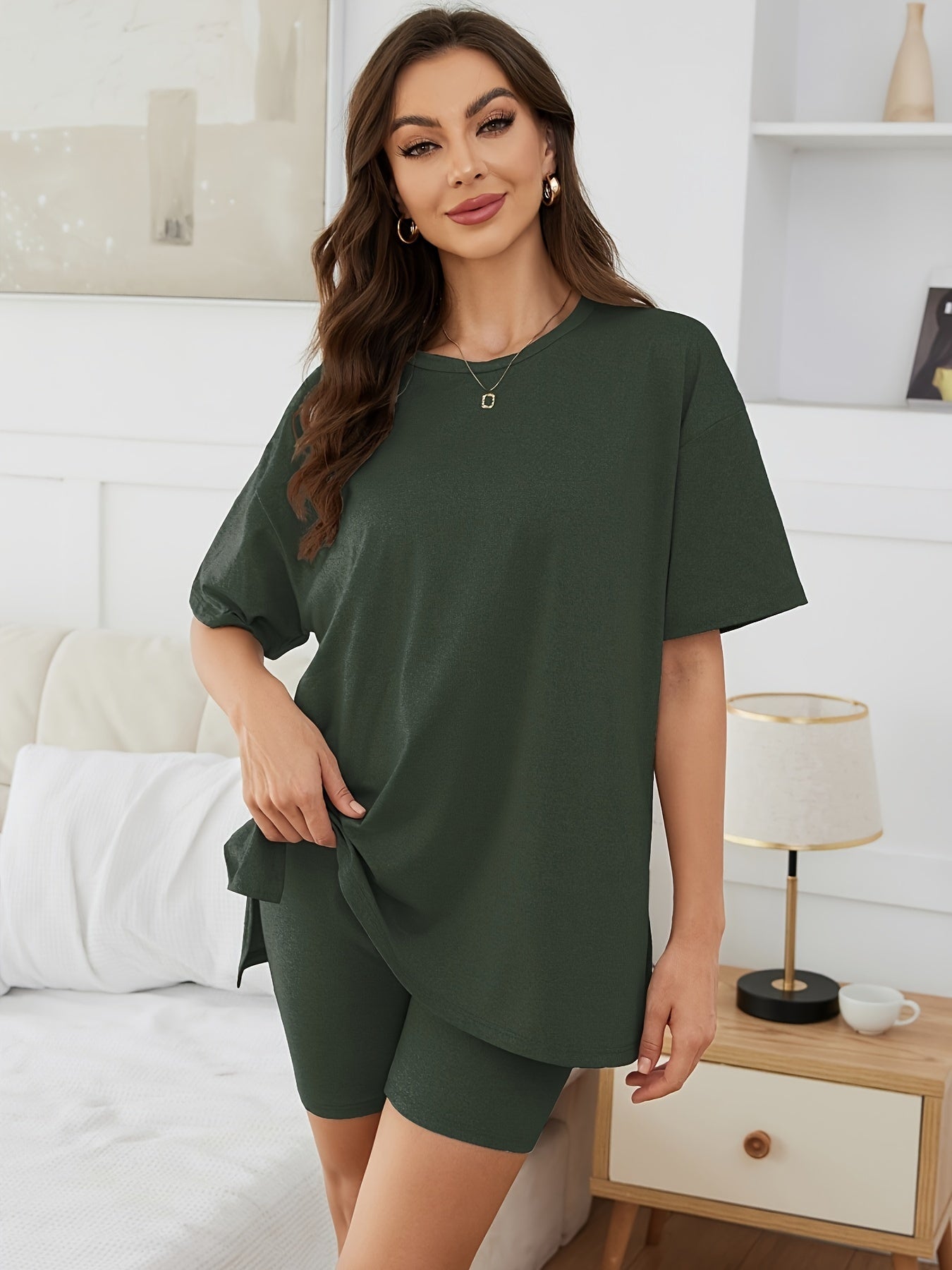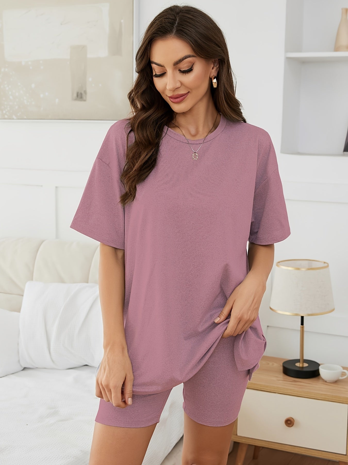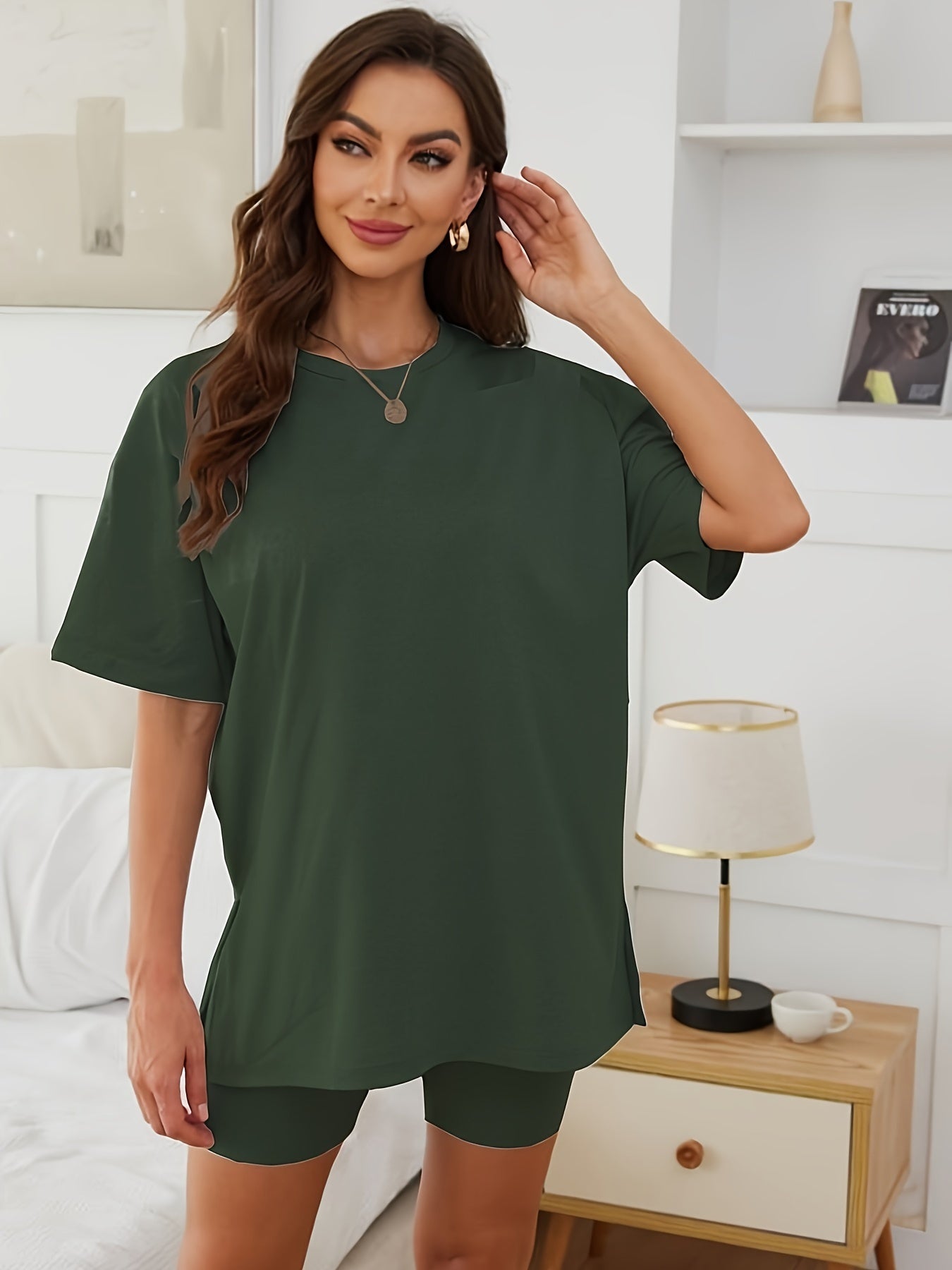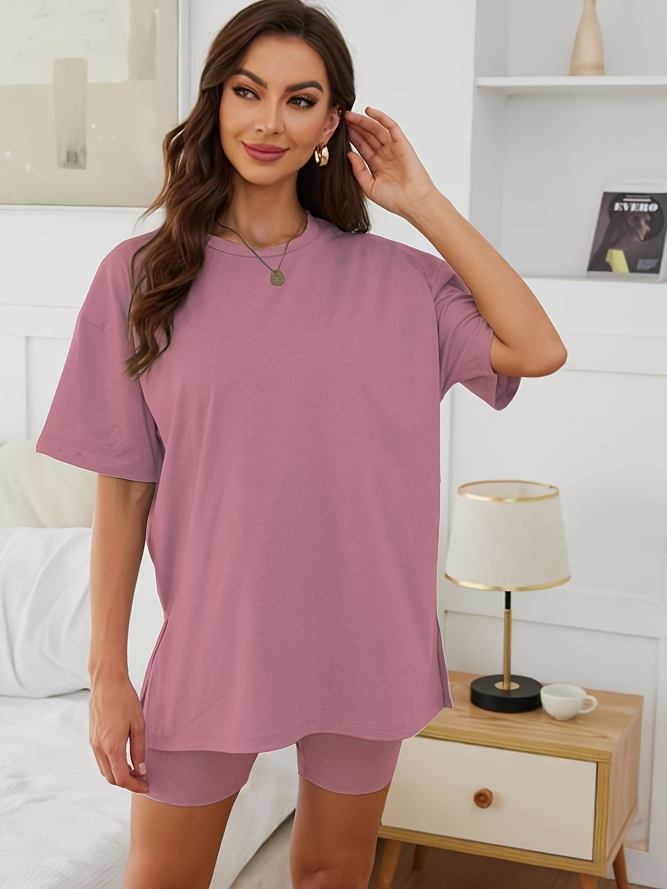 Կանացի ամառային սառը հարմարավետություն միաձույլ գույնի ազատ կլոր վզով վերնաշապիկ և բարակ շորտեր սպորտային հավաքածու, պոլիեսթեր տրիկոտաժե գործվածք, բոլոր սեզոնային, ամենօրյա սպորտային հանդերձանք