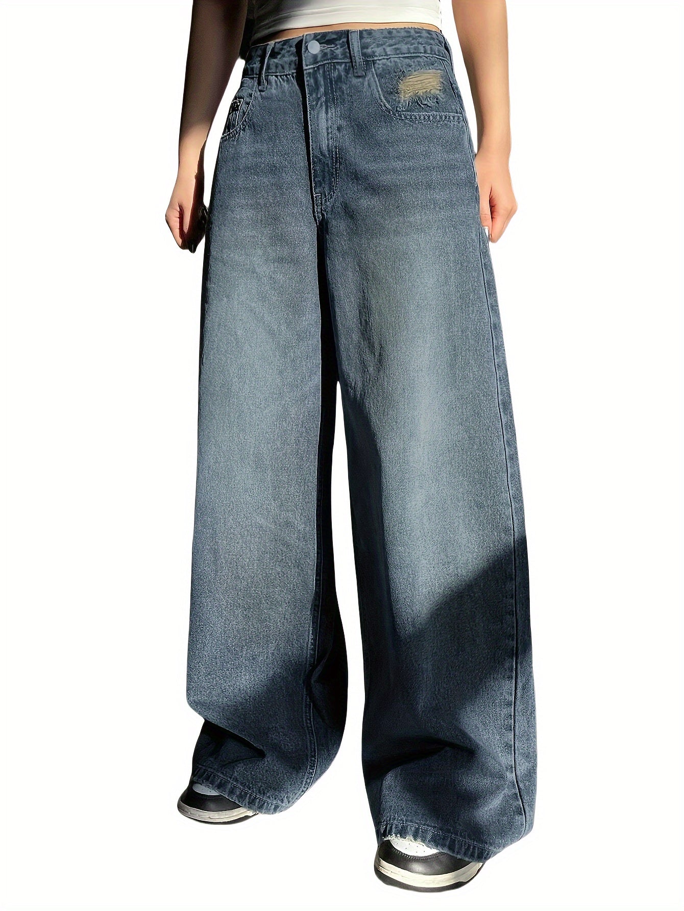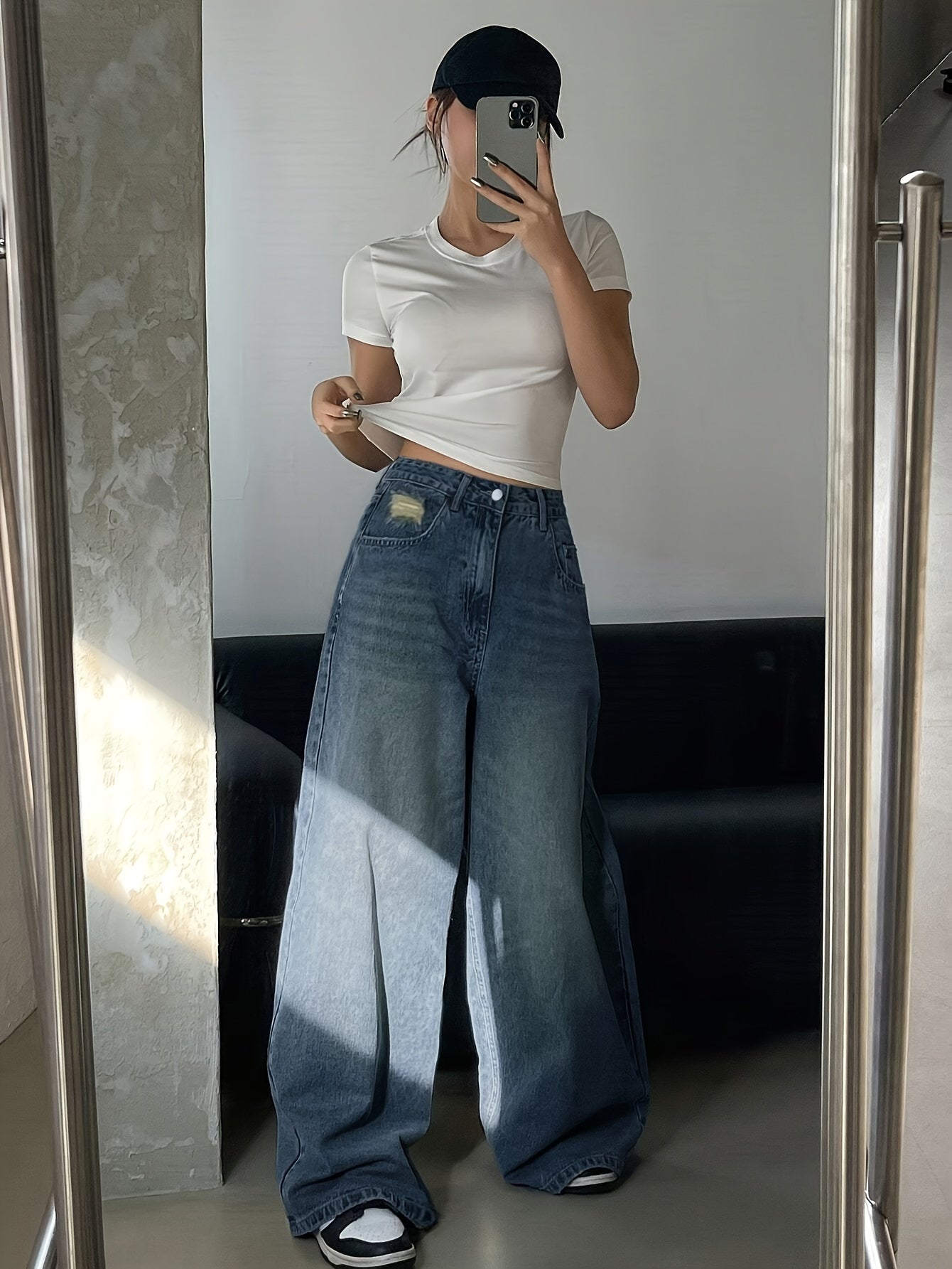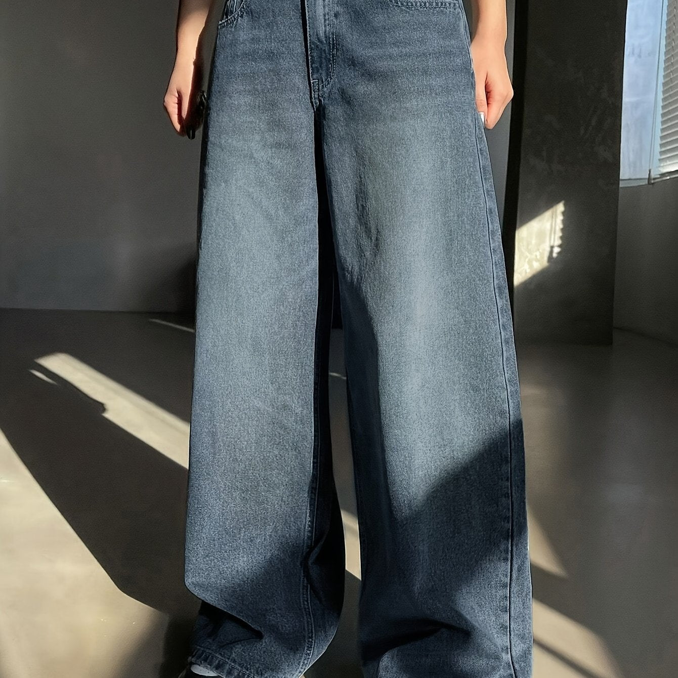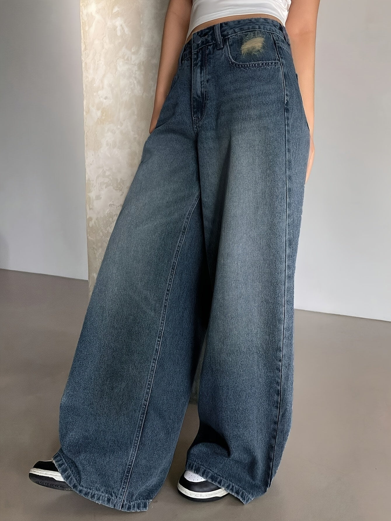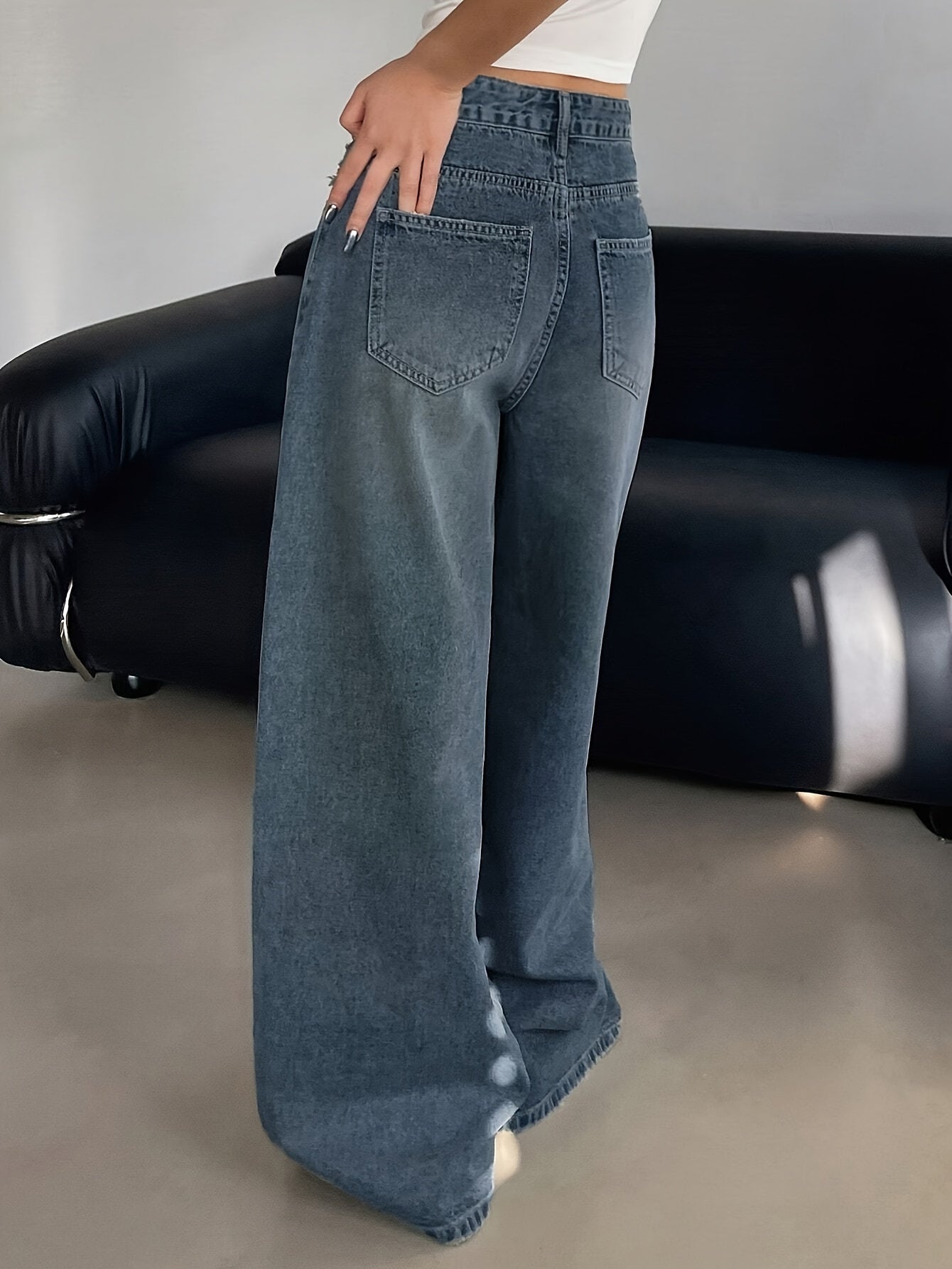 Կանացի վինտաժ լվացված կապույտ լայն ոտքերով ջինսեր - ազատ տեղավորվող, բարձրաճաշակ, կայծակաճարմանդով և կոճակներով փակվող, ձգվող ջինսեր, էլեգանտ ռետրո ոճ, ամենօրյա հագուստի ջինսեր|էլեգանտ ռետրո ջինսեր|դիմացկուն ջինսեր