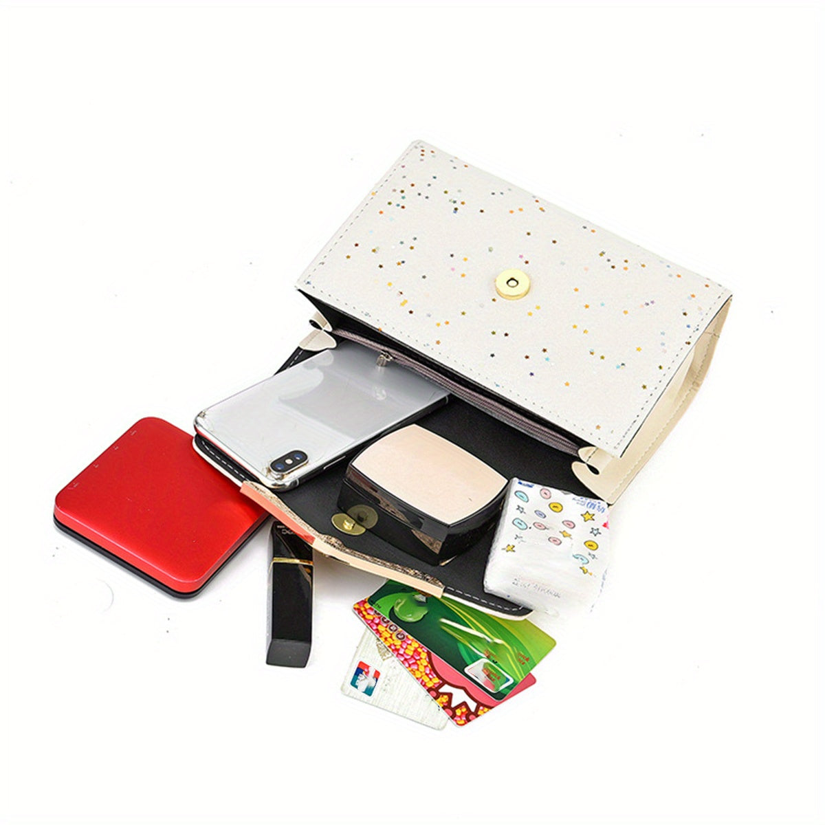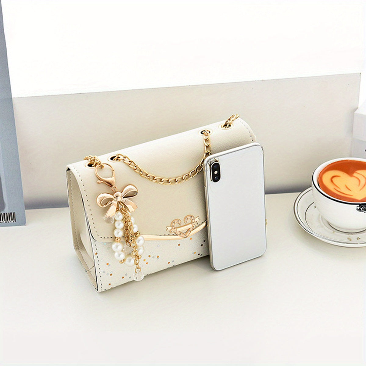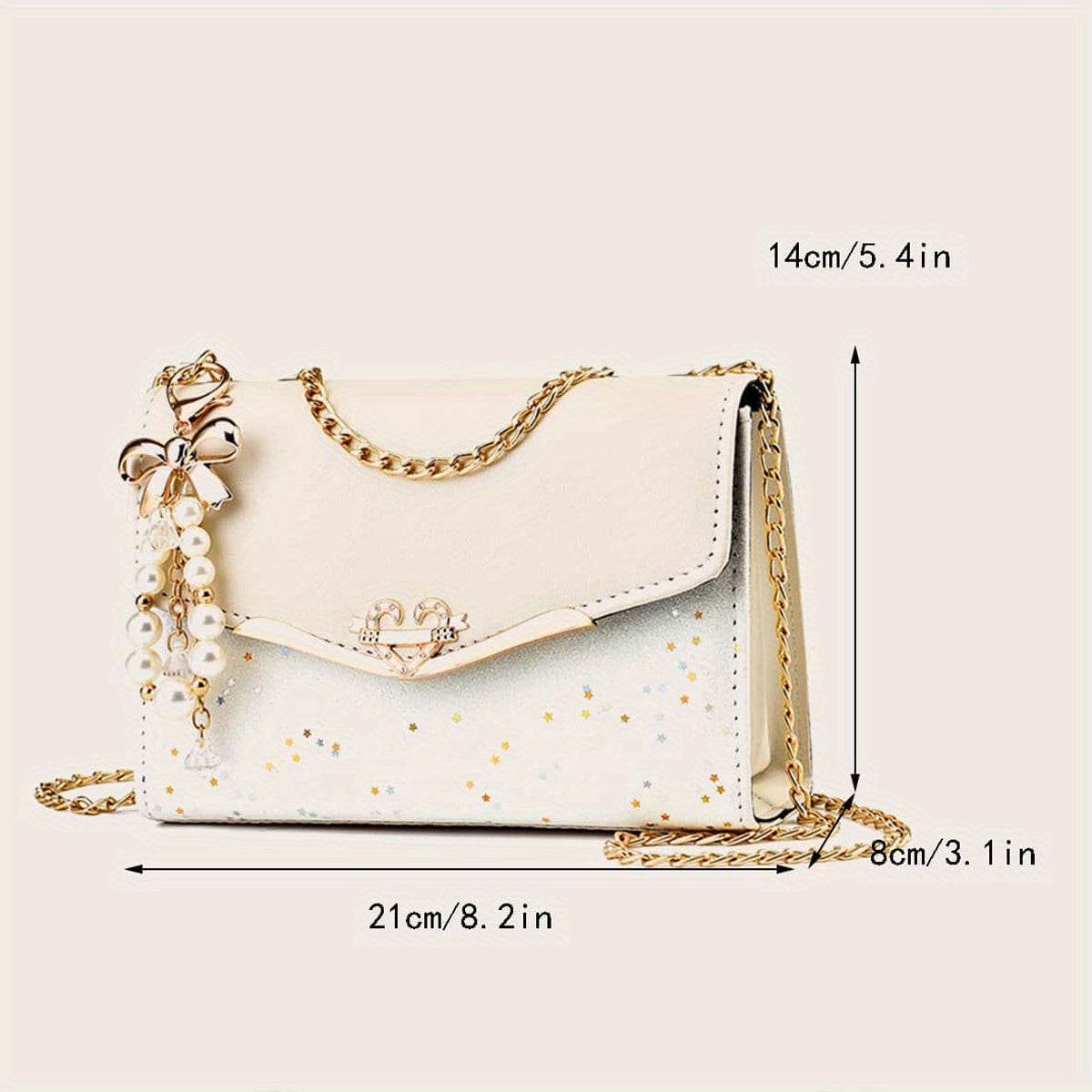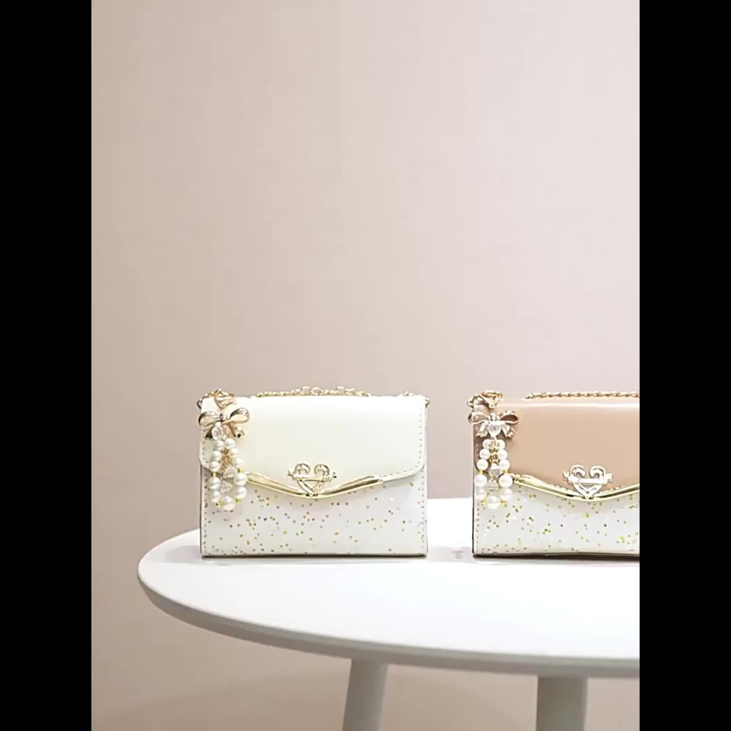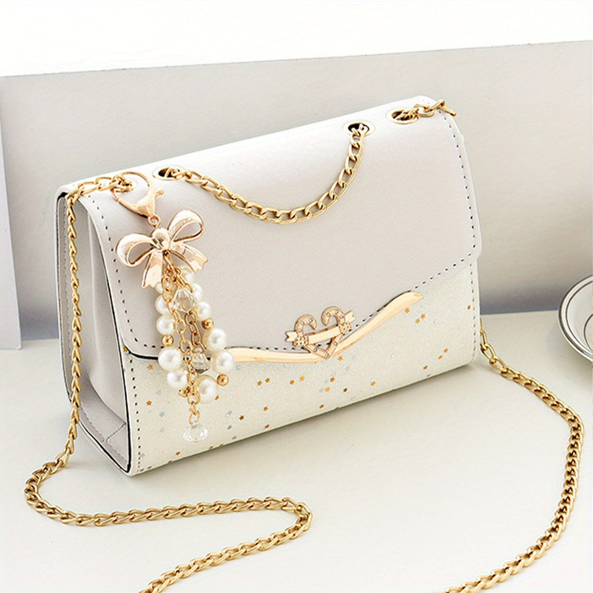 Կանացի սպիտակ, ոսկեգույն շղթայական ժապավենով և ժապավենաձև զարդարանքներով կրծկալով պայուսակ - թեթև, գործուղման, լողափի համար նախատեսված պայուսակ - կատարյալ նվեր Սուրբ Ծննդյան, ծննդյան օրերի, մայրերի օրվա, կրծկալով պայուսակ, լողափի աքսեսուար, դեկորի համար