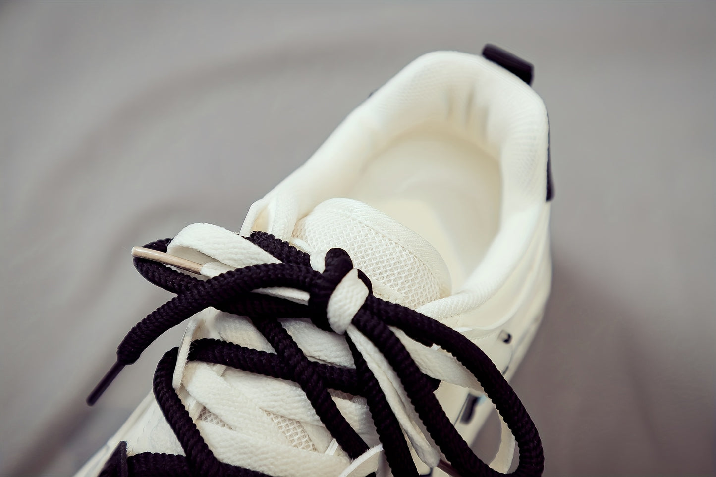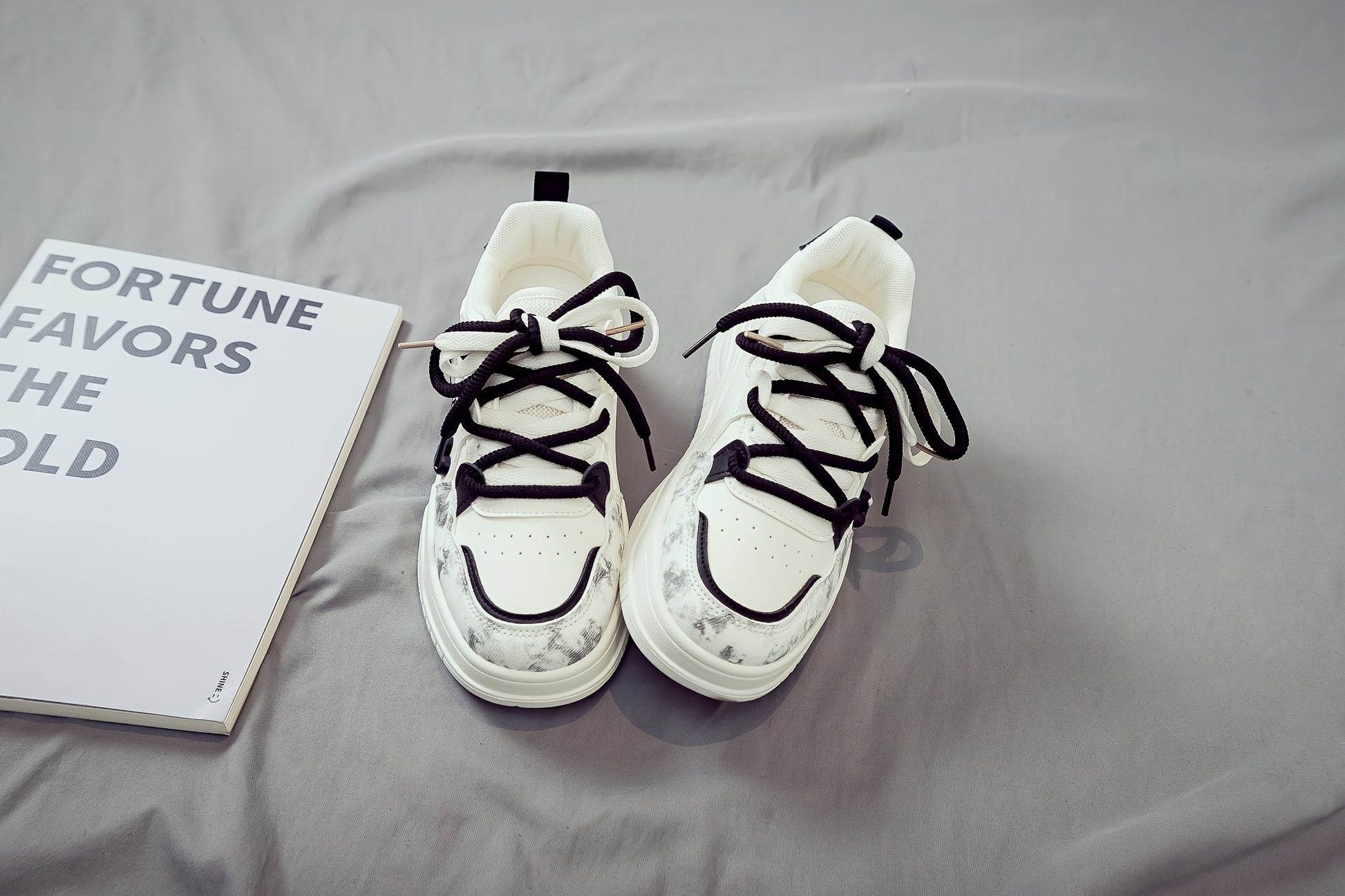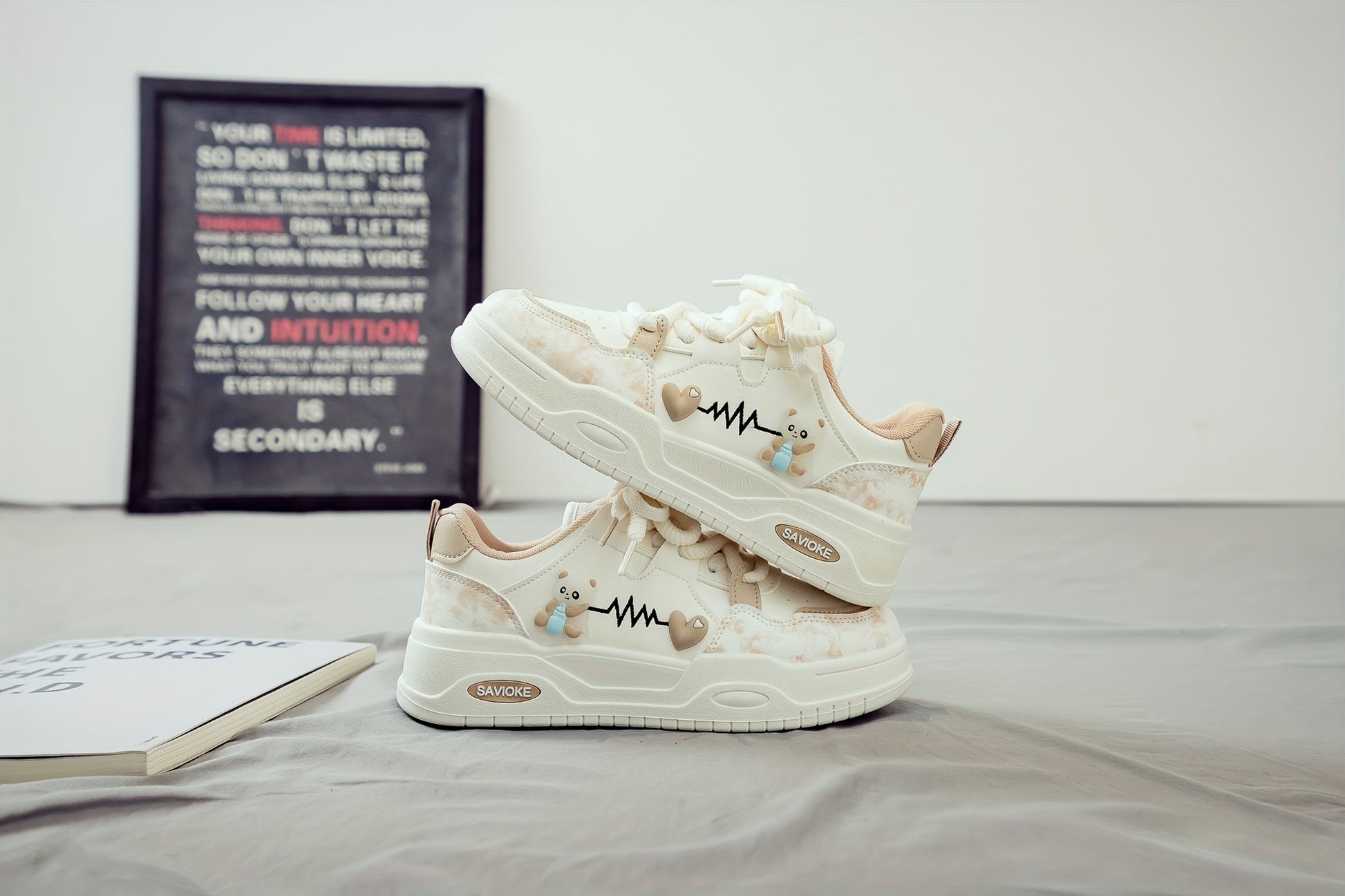 Կանացի սպիտակ միջին չափի սպորտային կոշիկներ՝ արջի և սրտի զոլավոր նախշերով, պոլիուրեթանային ծածկոցով և վերին մասով, հաստ փափուկ PVC ներբանով։ Նորաձև առօրյա կոշիկներ բոլոր եղանակների հարմարավետության համար։