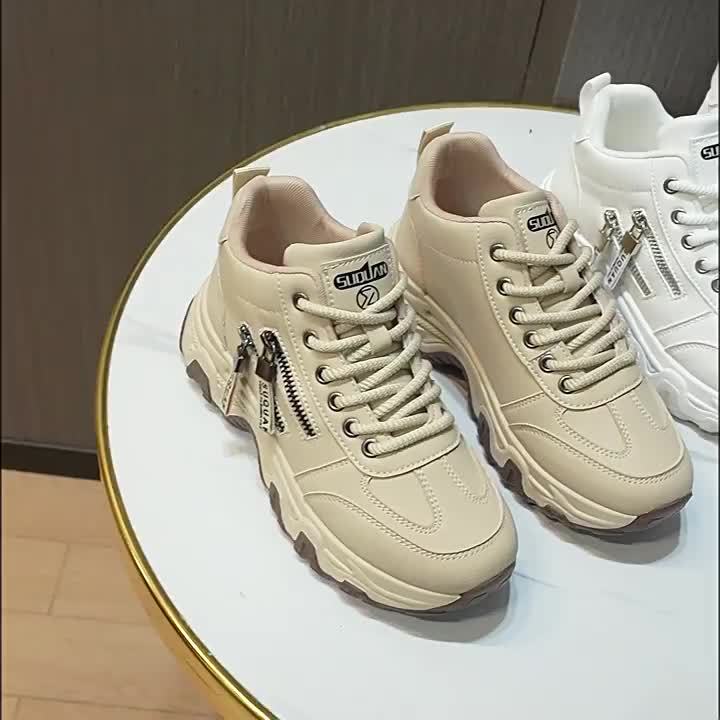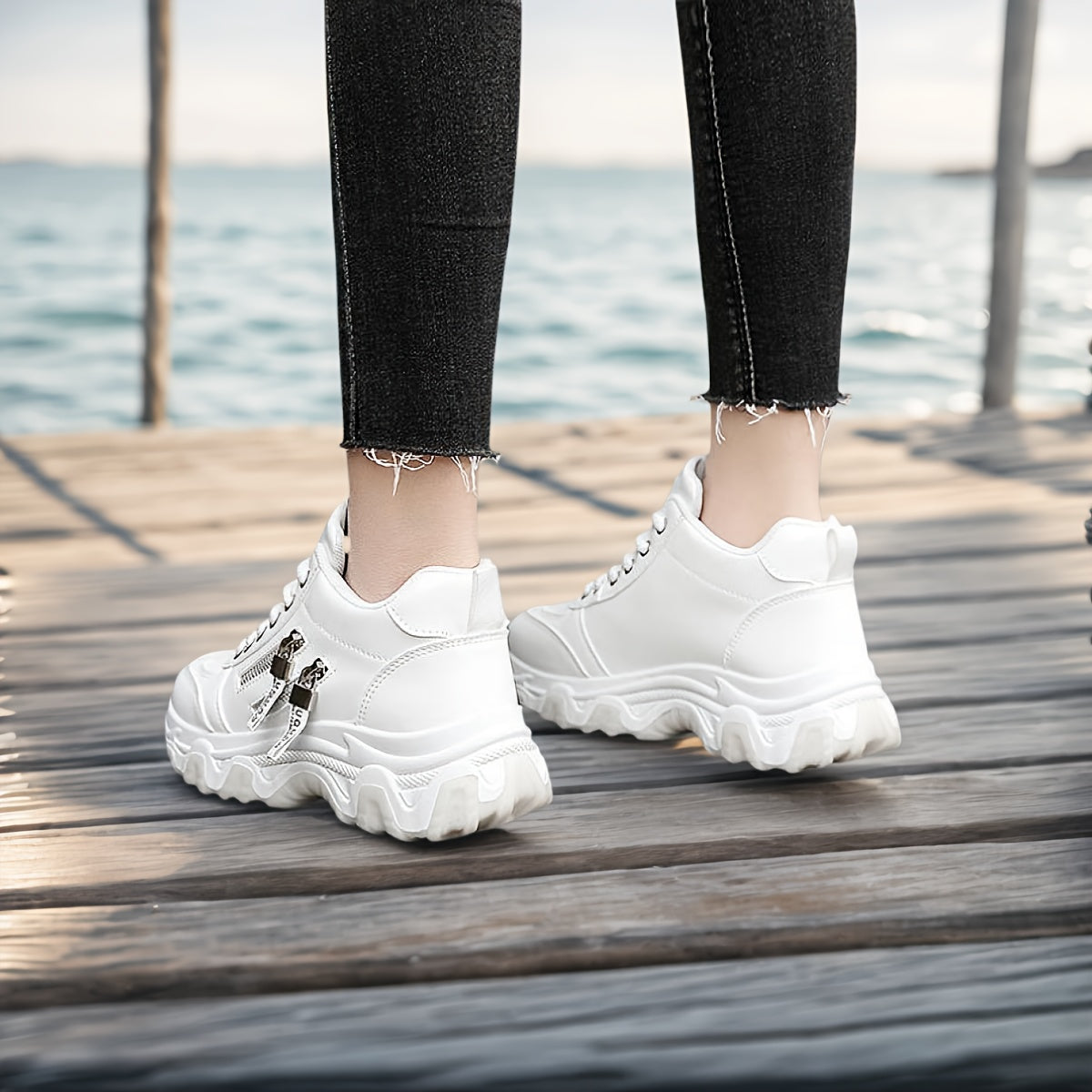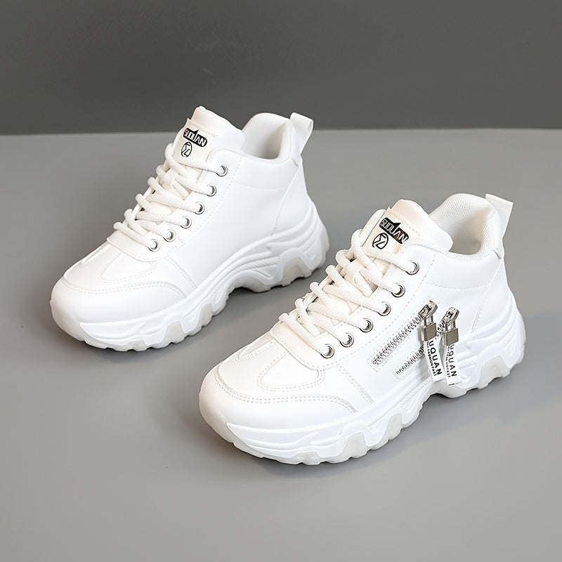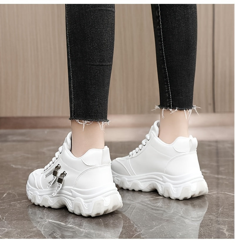 Women's White Platform Sneakers - Chunky Platform Shoes with Cushioned PVC Sole, Lace-Up Low-Top for Everyday, Travel, Office - All-Season Synthetic Cover - Leg-Lengthening Design, Ladies Sneakers, Travel Footwear, Chunky Sol