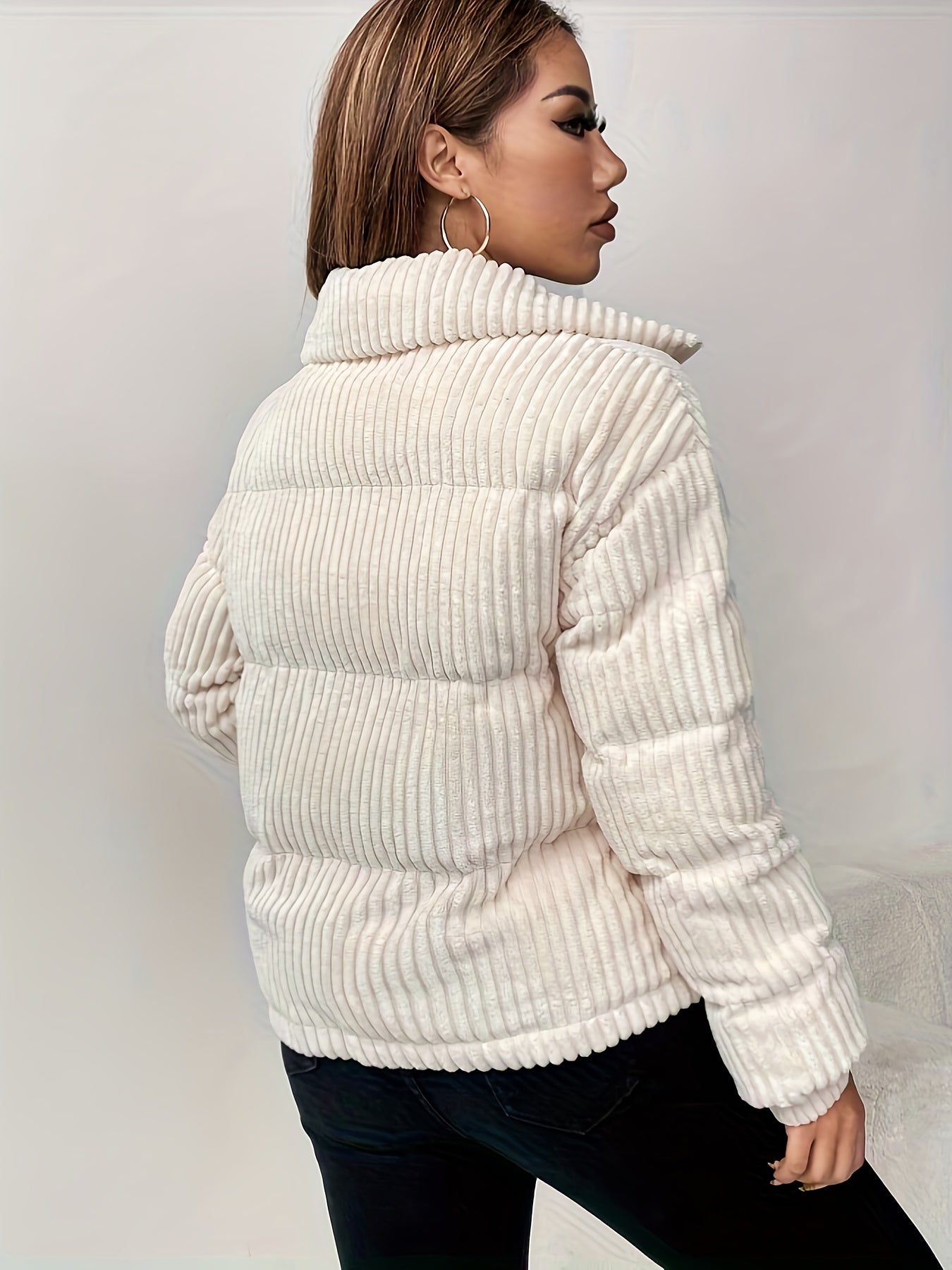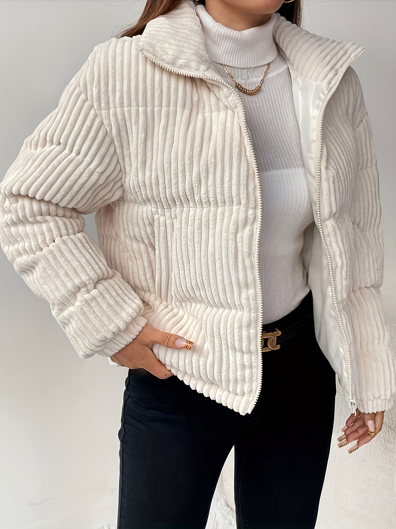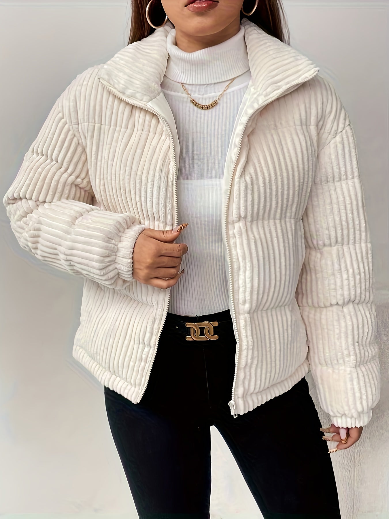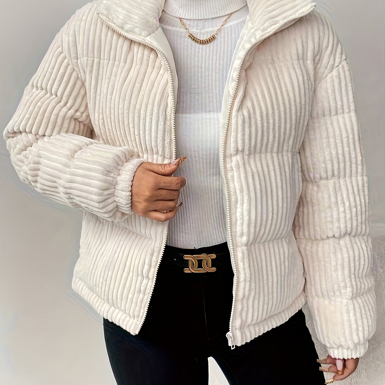 Կանացի սպիտակ փքված բաճկոն՝ կայծակաճարմանդով և թավշանման վերնամասով - Բեժ ձմեռային վերարկու, լվացքի մեքենայով լվացվող ցուրտ եղանակի վերնազգեստ, էլեգանտ կարճ կտրվածք (առանց գոտու)՝ առօրյա կամ պաշտոնական օգտագործման համար, կանացի բաճկոններ, ձմեռային հագուստ