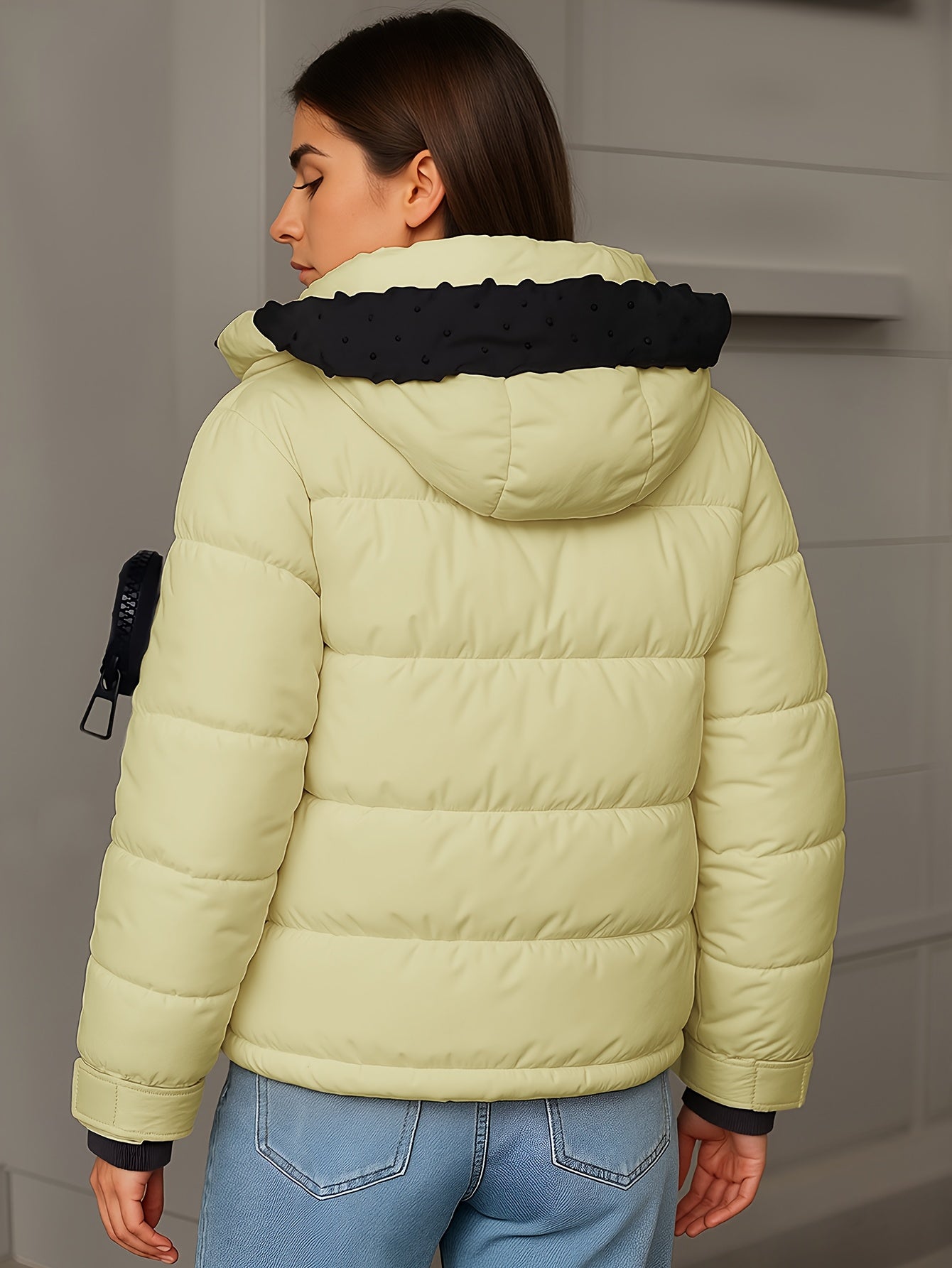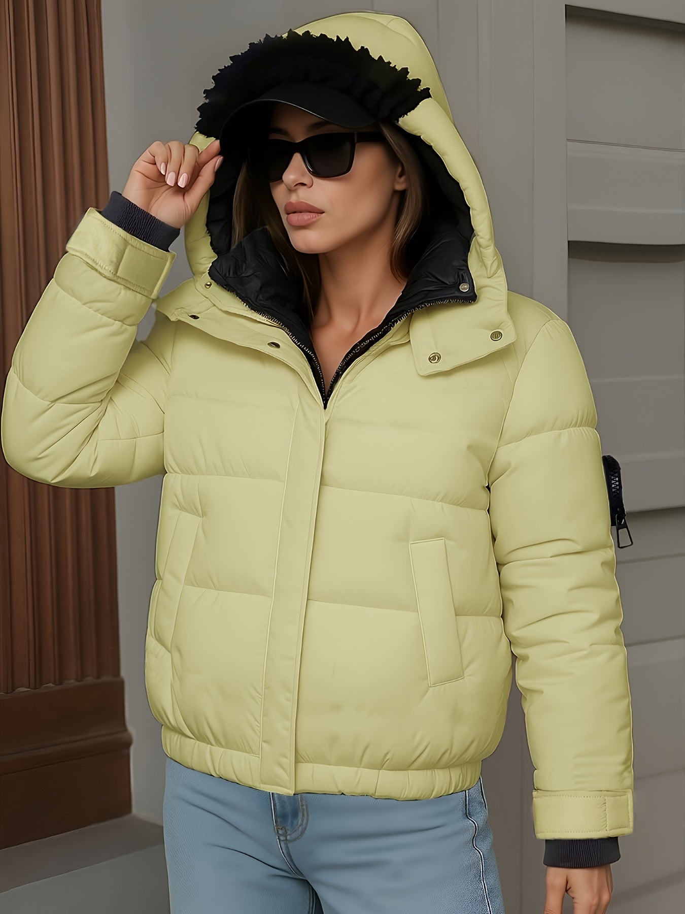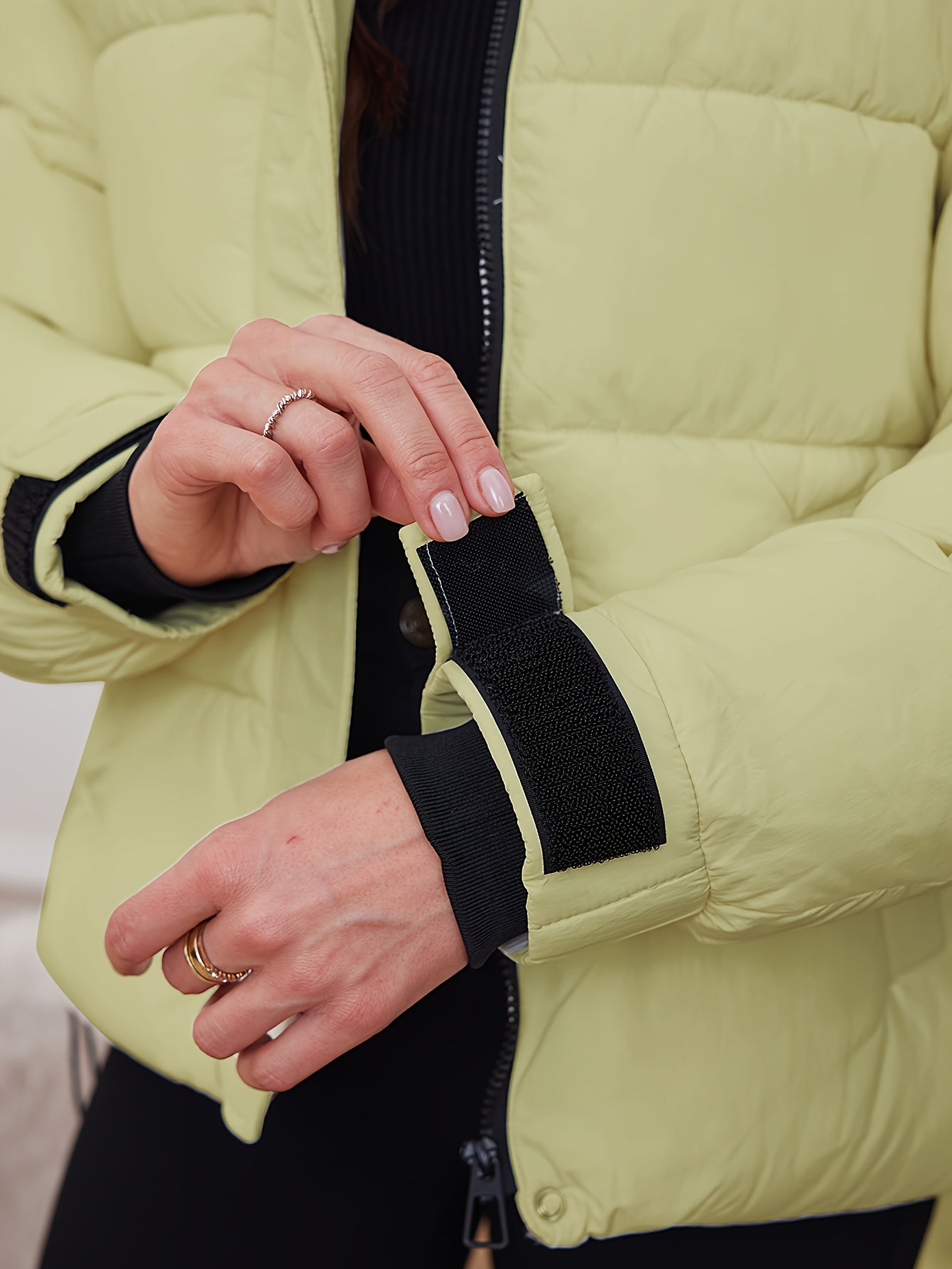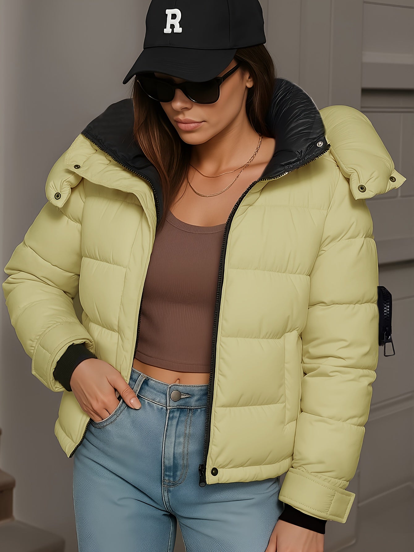 Կանացի ձմեռային կարճ գլխարկով բաճկոն՝ մանանեխի, դեղին և սև գույների հակադրությամբ, փքված վերարկու գրպաններով, գոտի և ամուր կայծակաճարմանդ, առօրյա, էլեգանտ վերնազգեստ ցուրտ եղանակի համար (ձեռքով լվացում/քիմմաքրում), հաստ ձմեռային բաճկոն կանանց համար, Win