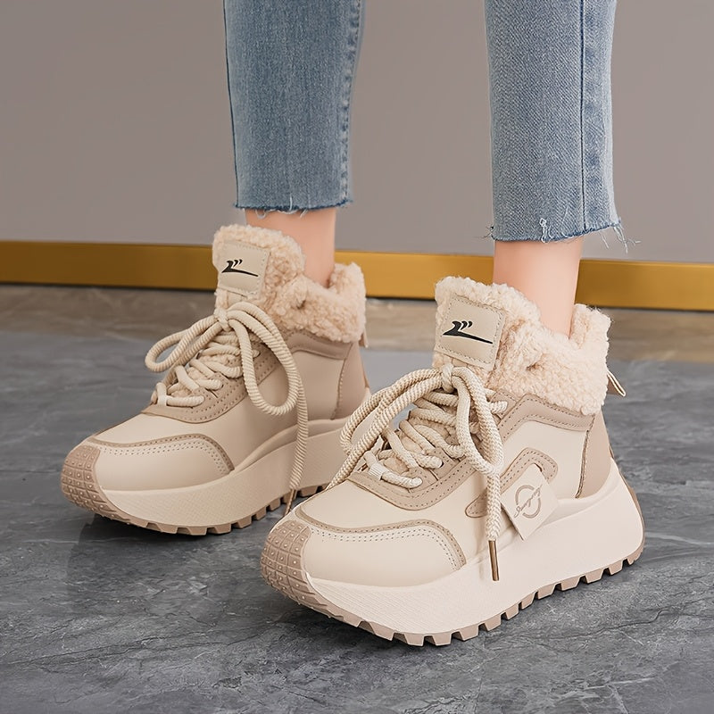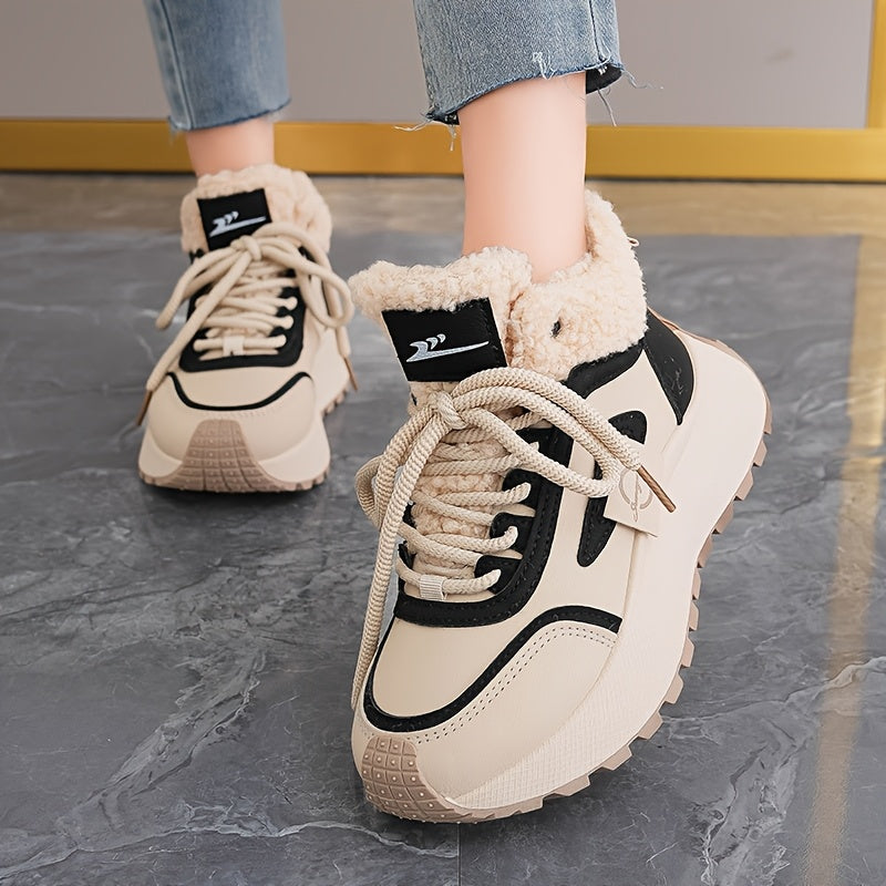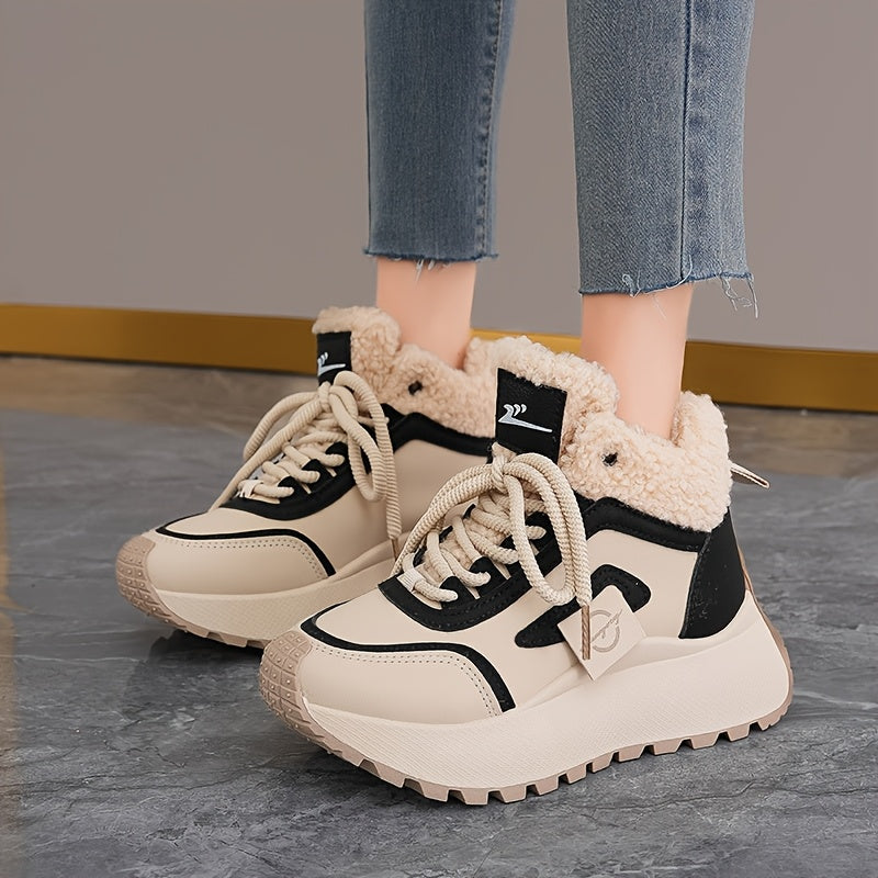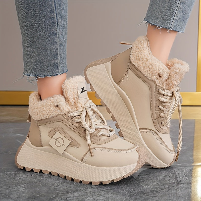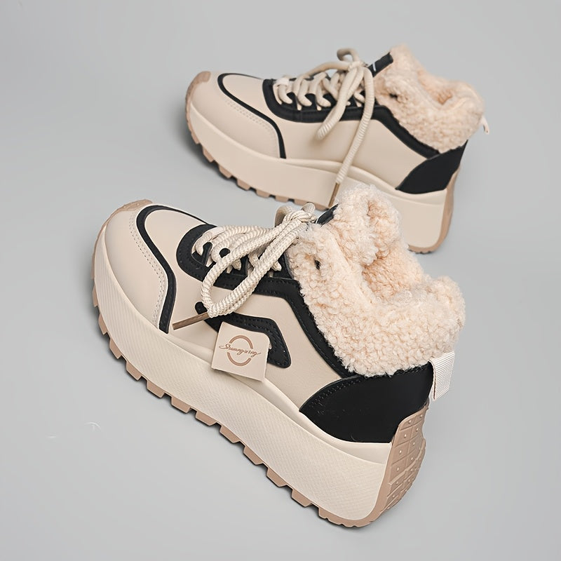 Կանացի ձմեռային ձնագնացքներ հաստ, փափուկ PVC ներբանով՝ բարձրացնող էֆեկտով - սահքից պաշտպանող, արհեստական կաշվե վերնամասով և փափուկ ծածկույթով, բեժ/սև գույն - ամենագնացքային ճկունություն սառույցի, ձյան և ամենօրյա կրման համար -