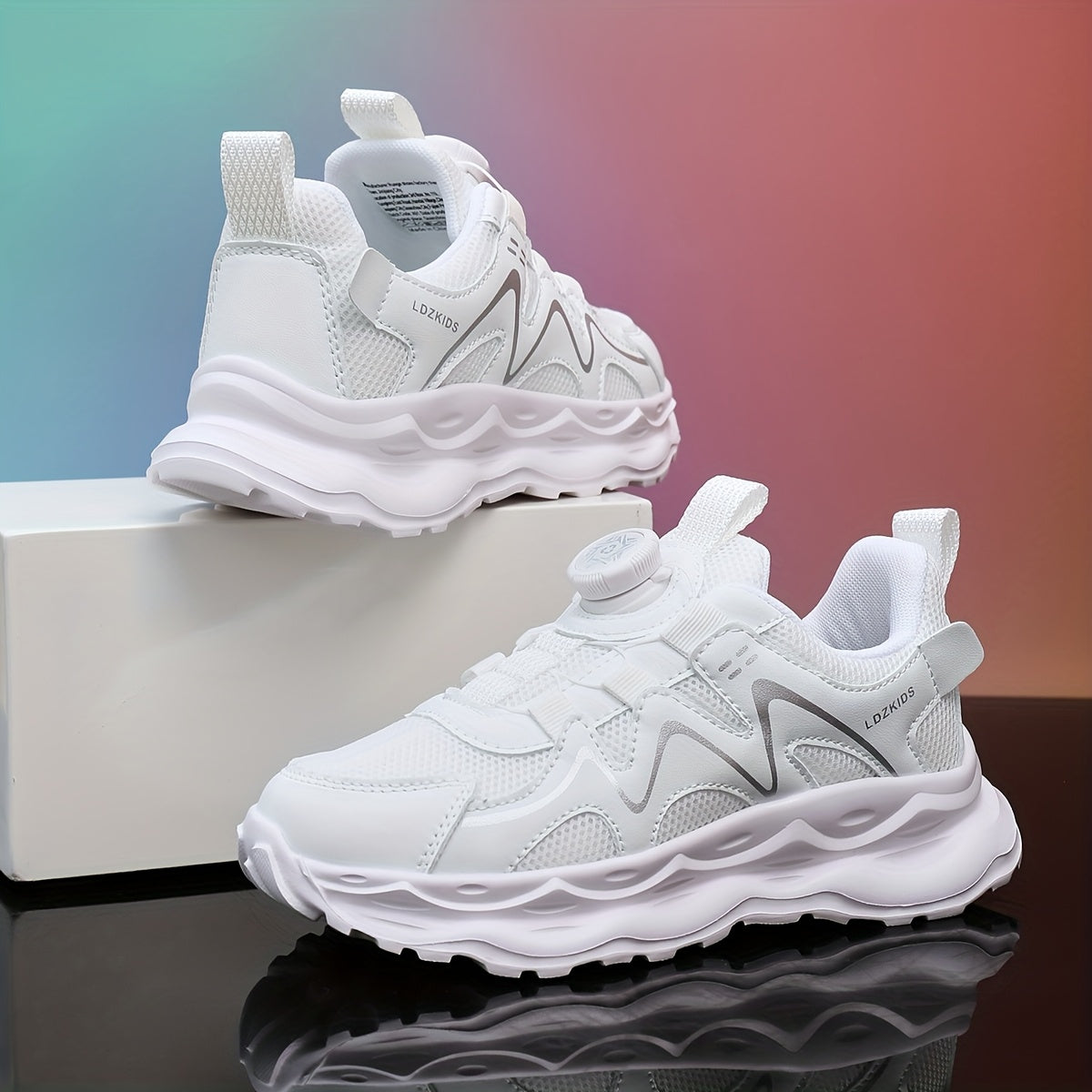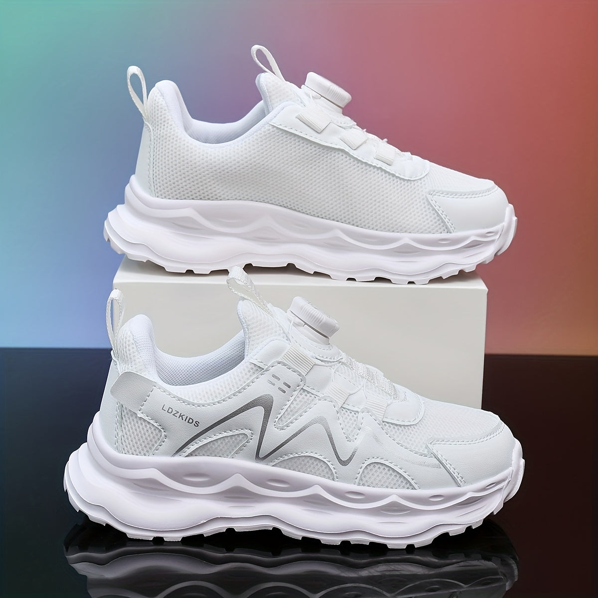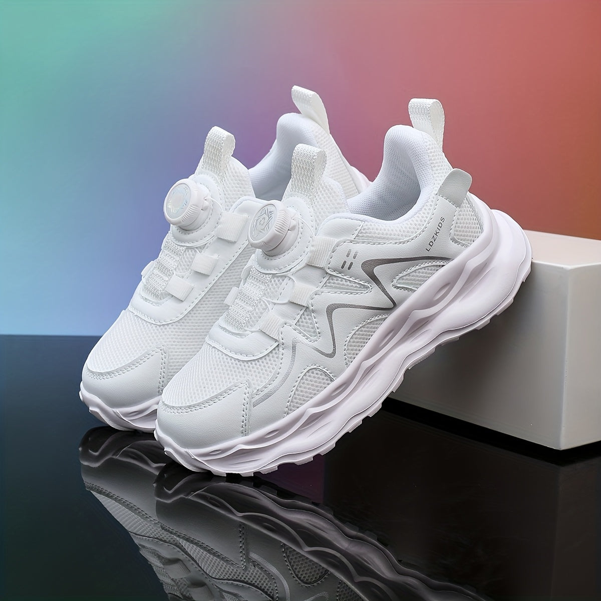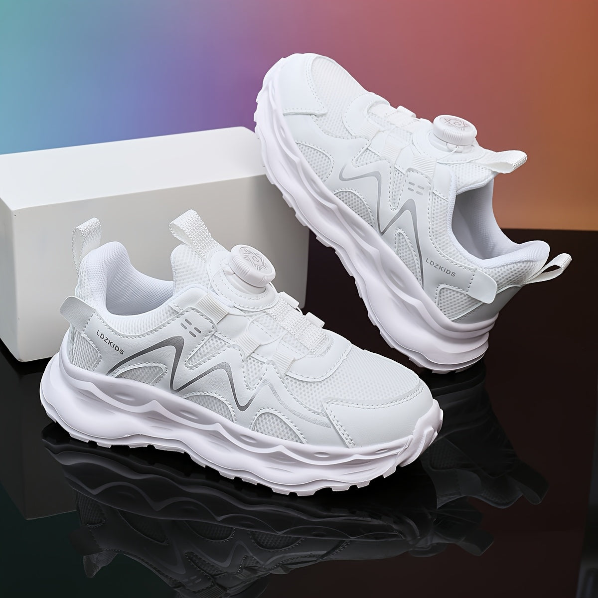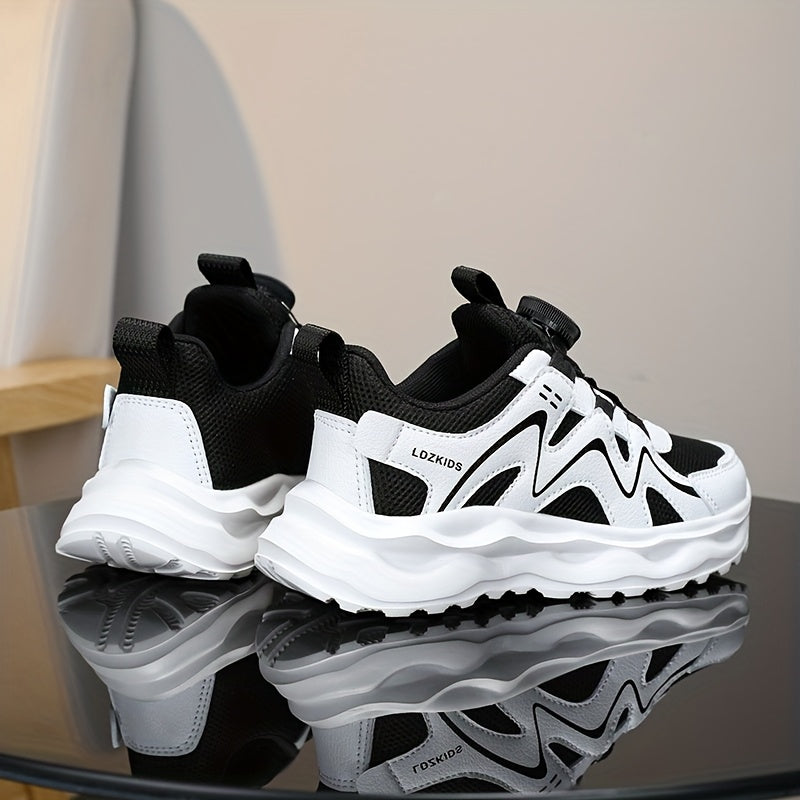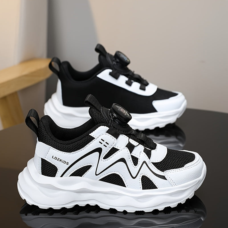 Youngsters' Breathable Athletic Sneakers with Rotating Buckle Closure - White & Navy Blue Striped Design, EVA Cushioned Sole, Low-Top Casual Shoes for Boys & Girls, All-Season Comfort, Youngsters Sneakers, Youngsters'S Footwe