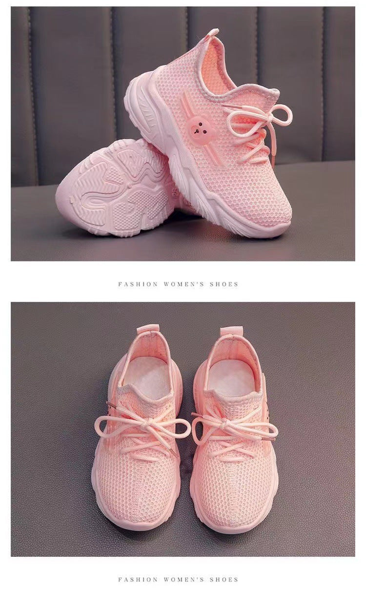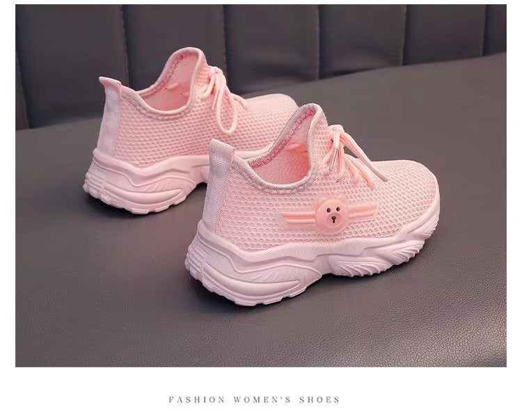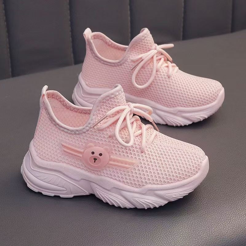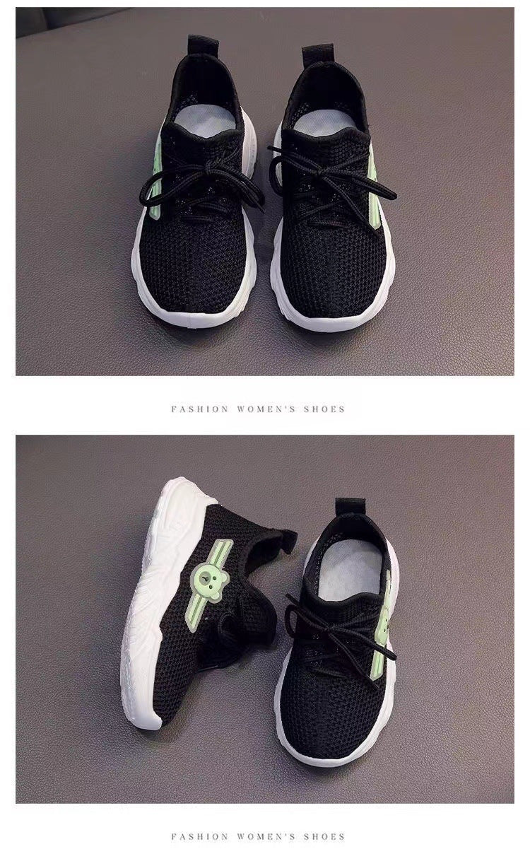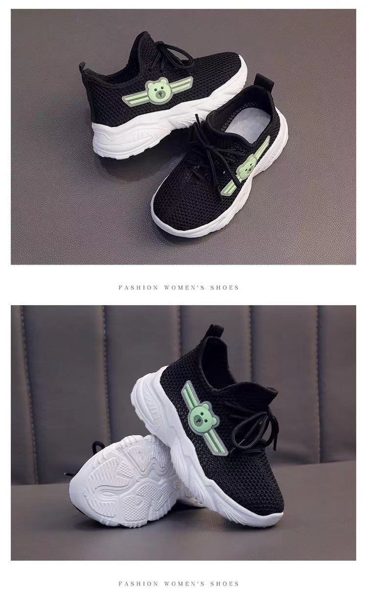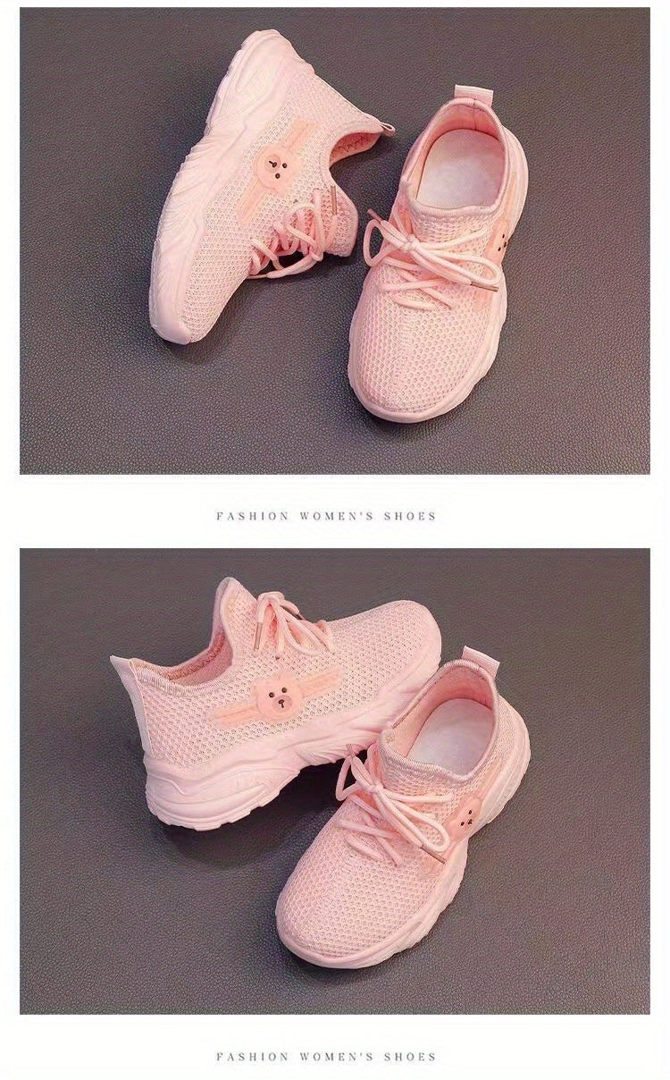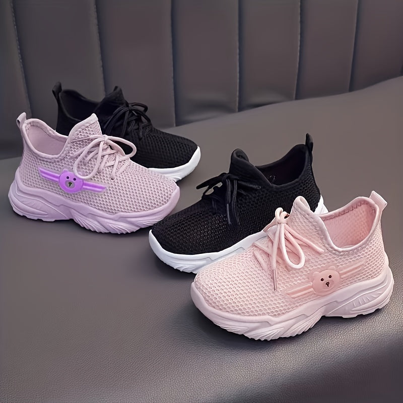 Youngsters' Breathable Cartoon Bear Sneakers - Cute Low-Top Lace-Up Shoes for Boys & Girls, Lightweight & Comfortable with Rubber Sole, Animal Print Design, All-Season Wear, Black/Green & Pink/Purple Options, Kid Shoes, Young