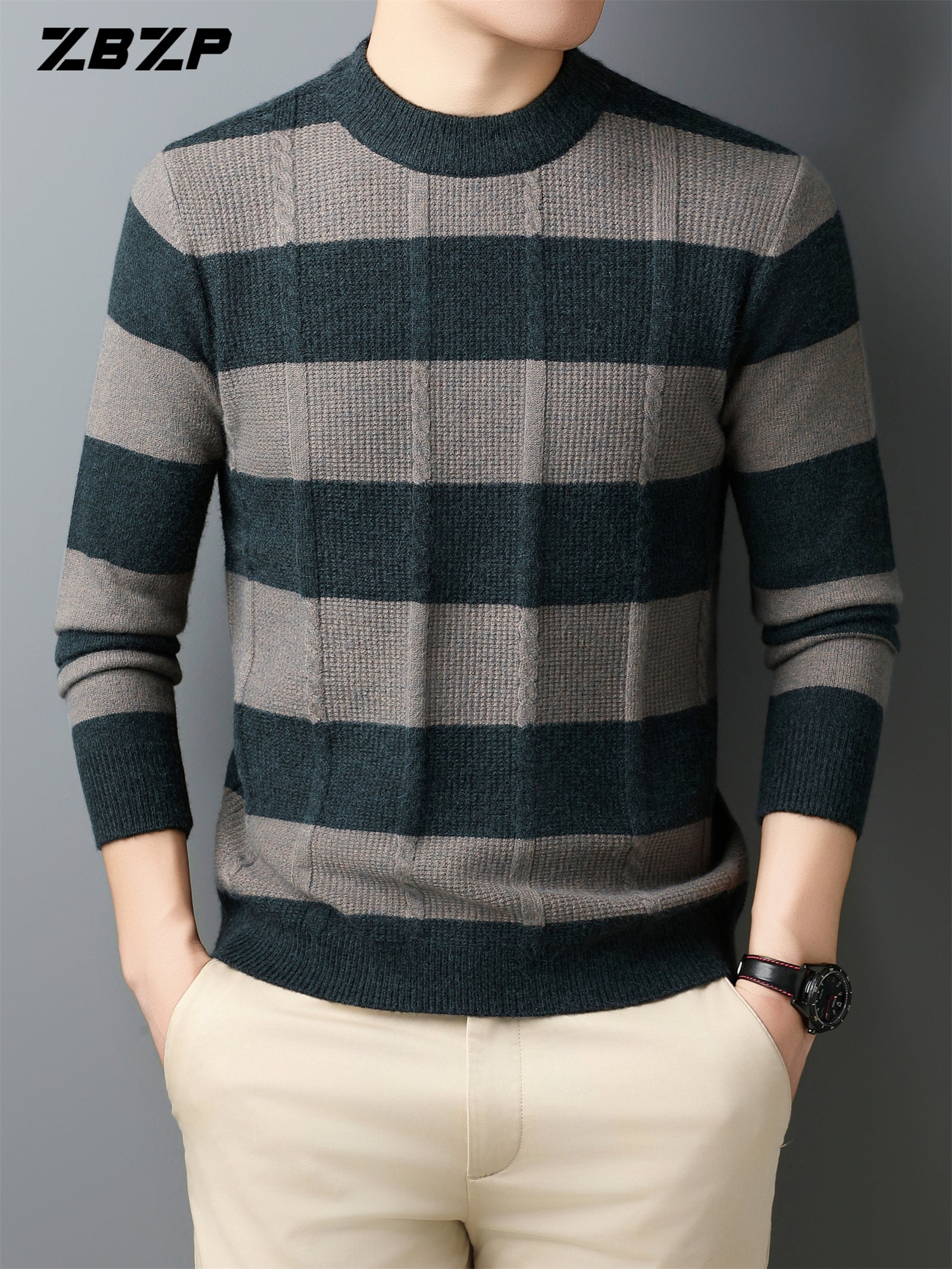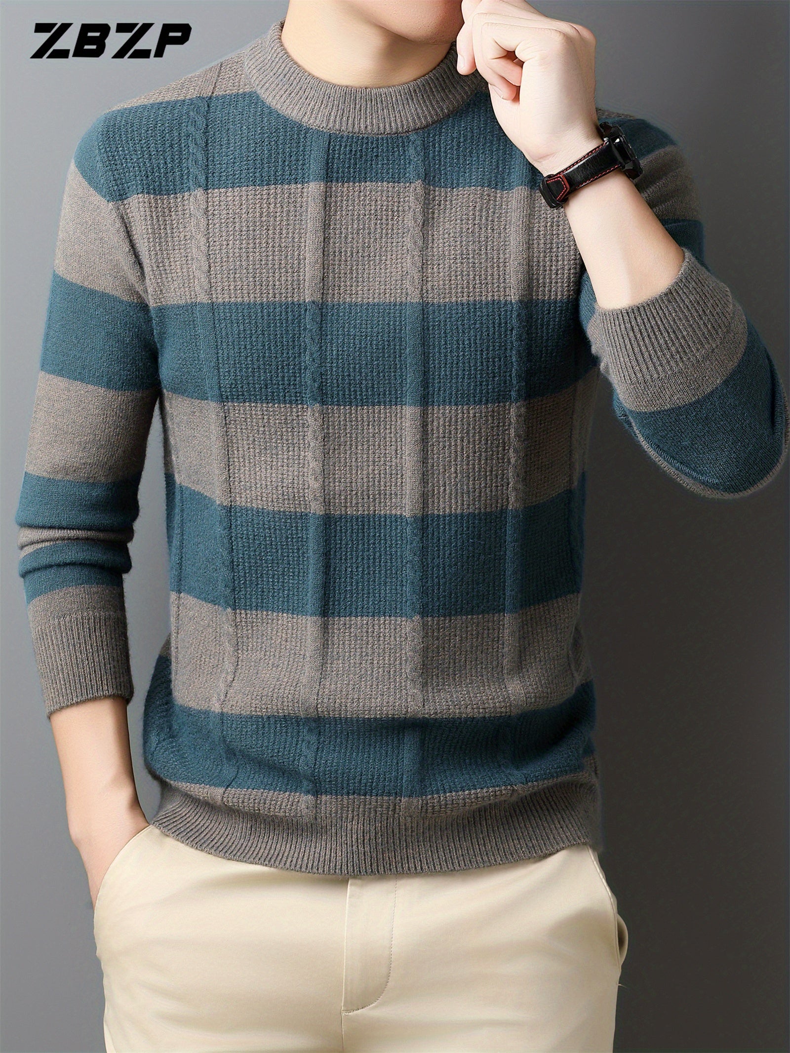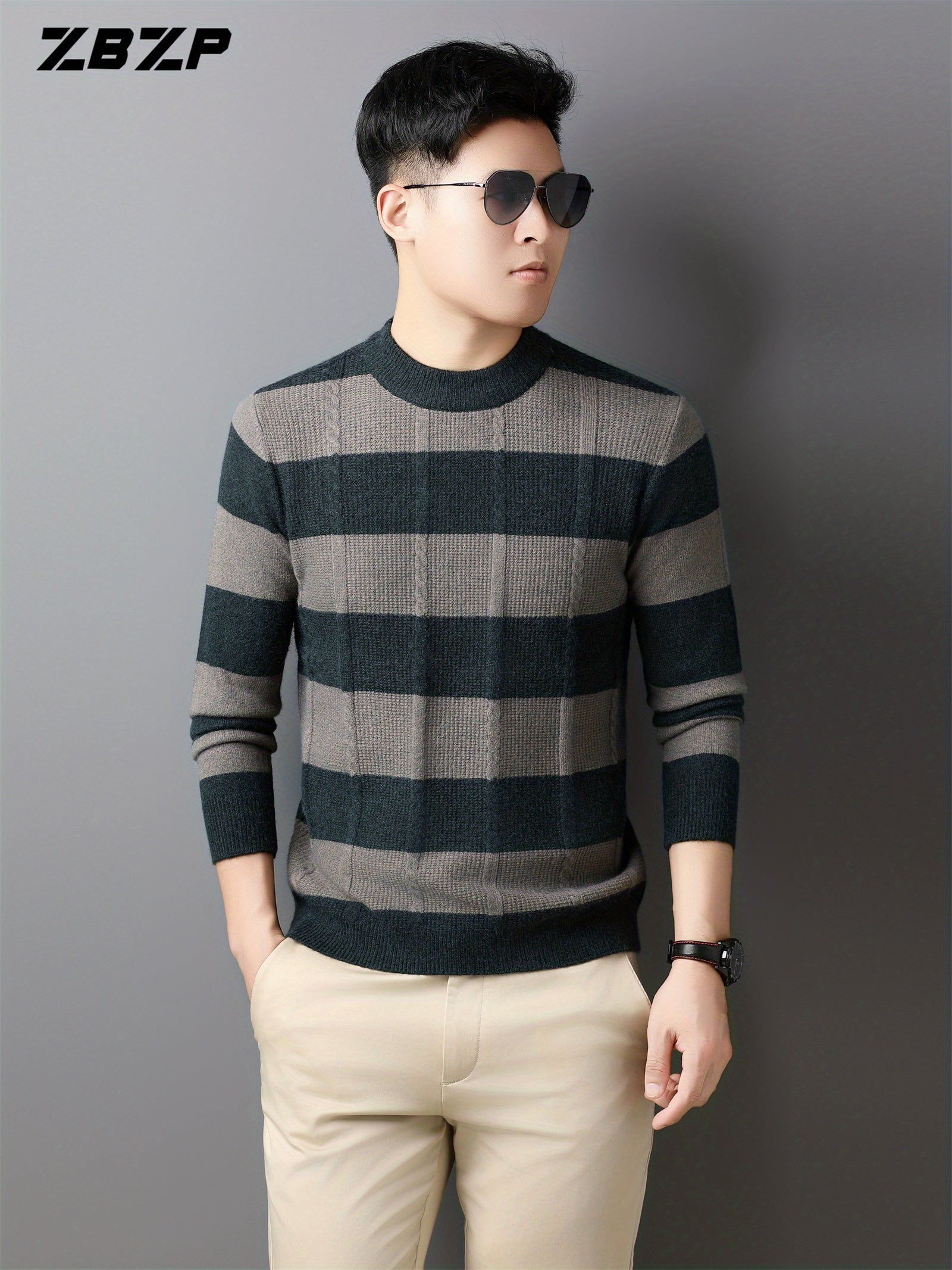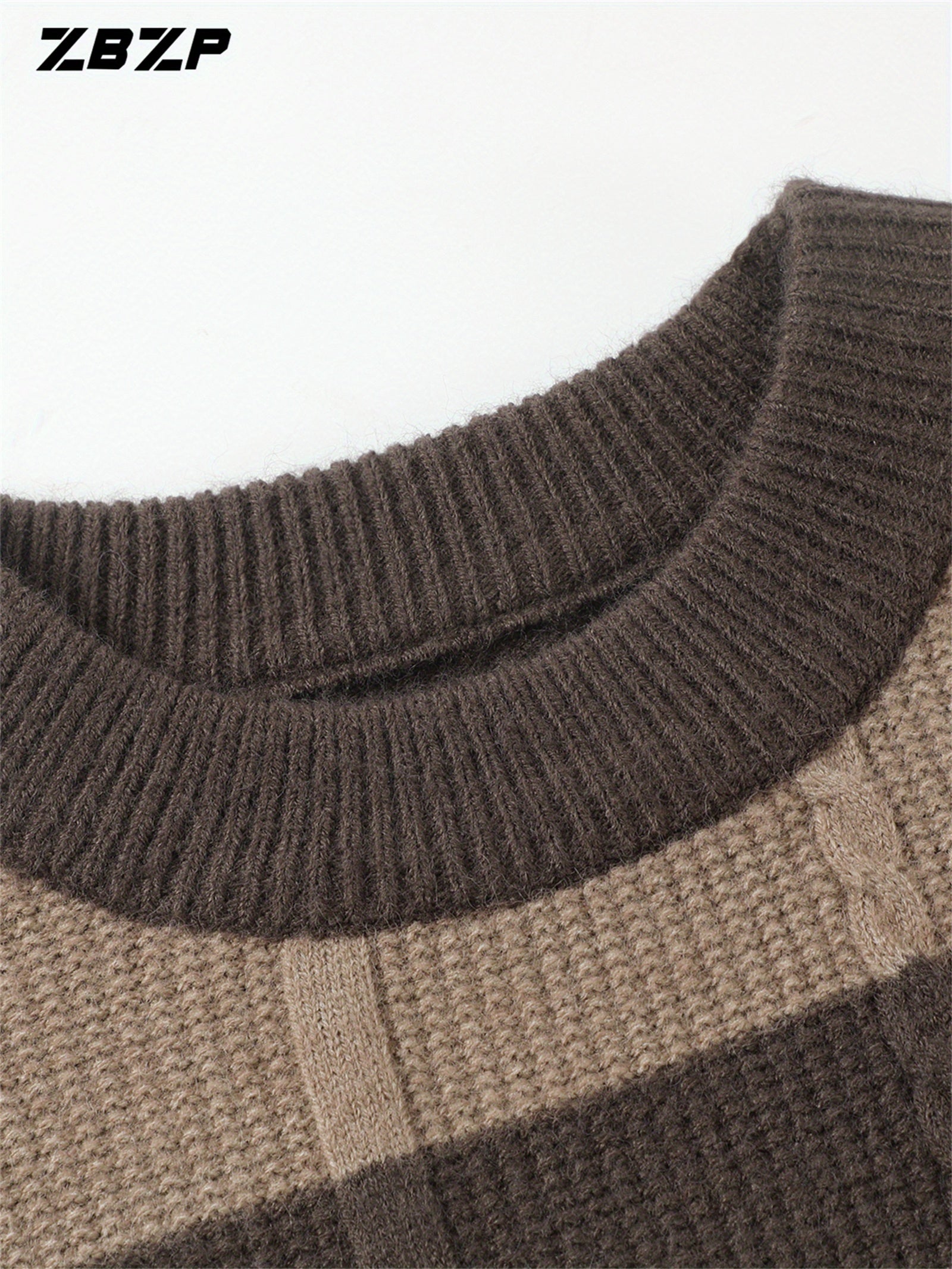 ZBZP Men'S Casual Striped Knit Sweater - Dark Gray & White Horizontal Stripes, Round Neck Long Sleeve, Regular Fit, Autumn Winter Warm Pullover for Casual Attire, Knit Sweater, Comfortable Fashion, Soft Texture, Cold Weather