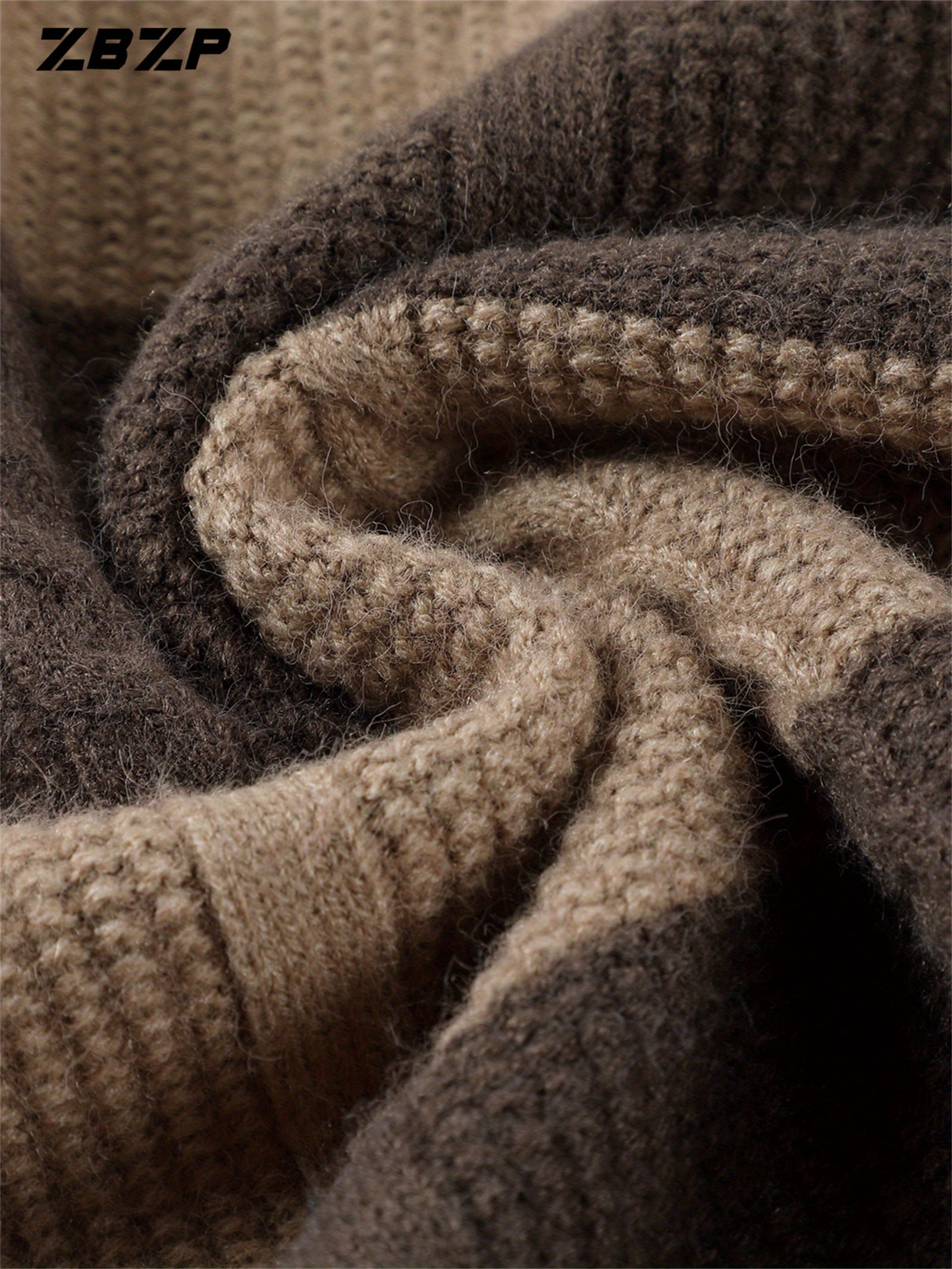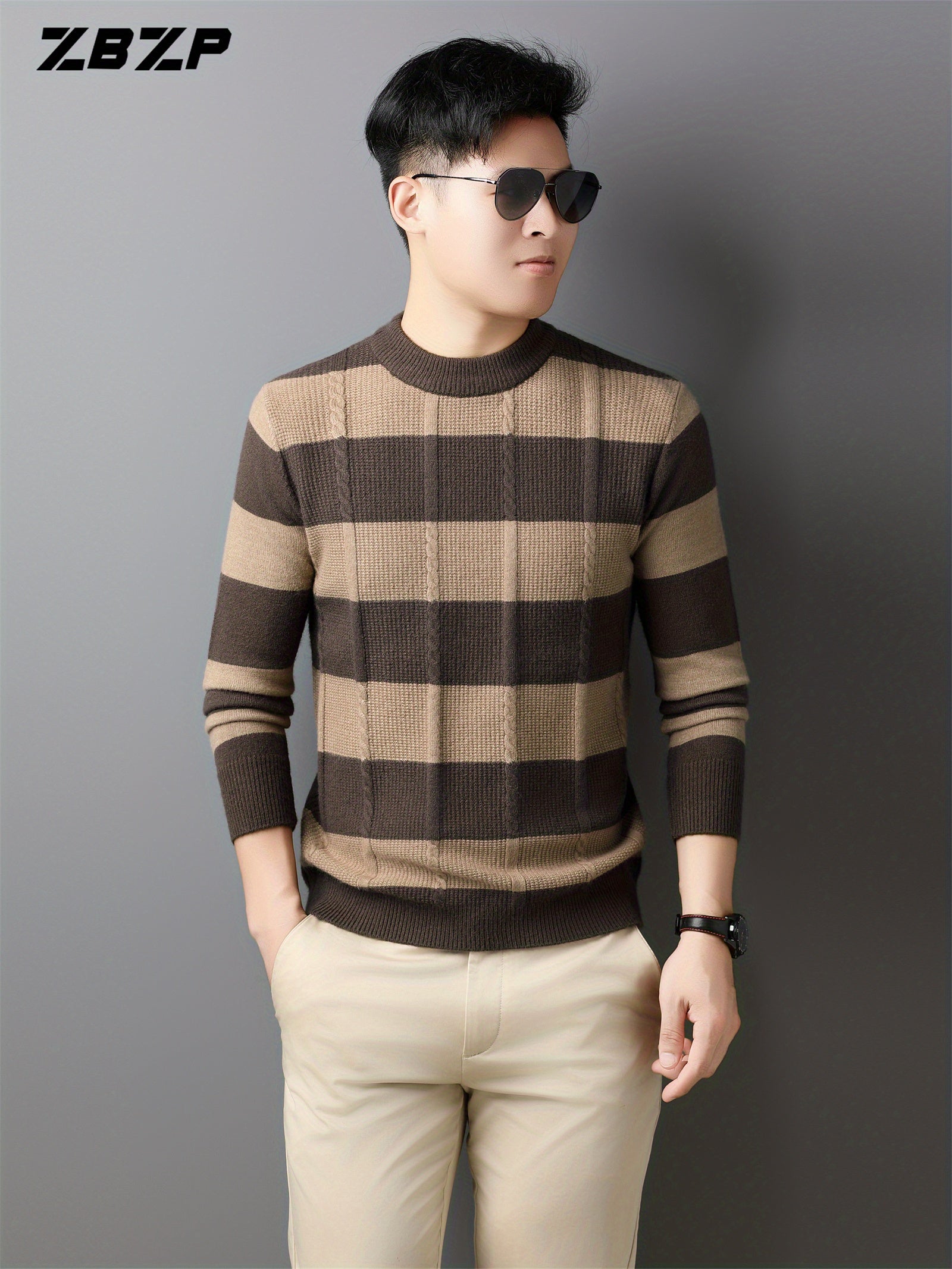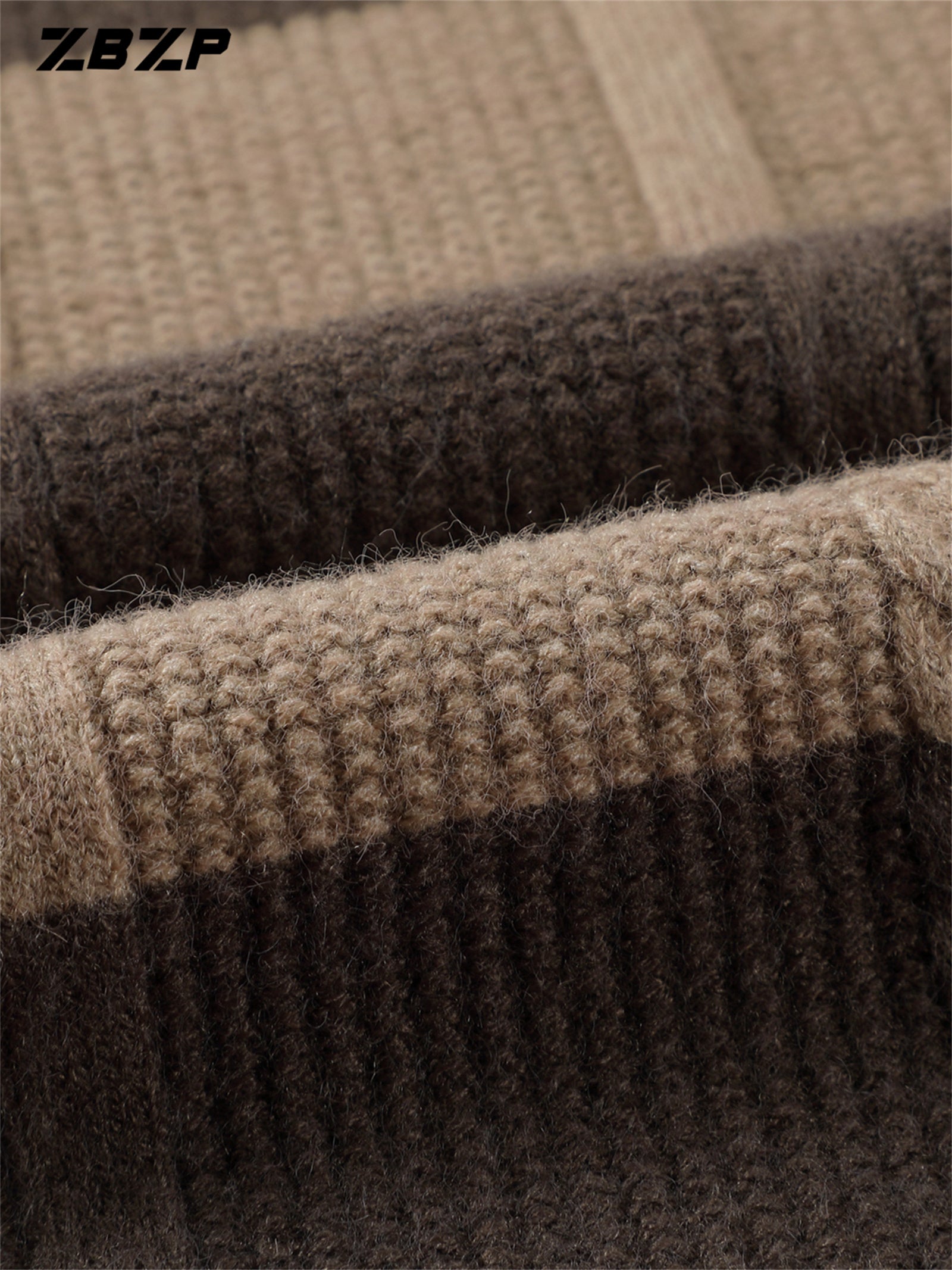 ZBZP Men'S Casual Striped Knit Sweater - Dark Gray & White Horizontal Stripes, Round Neck Long Sleeve, Regular Fit, Autumn Winter Warm Pullover for Casual Attire, Knit Sweater, Comfortable Fashion, Soft Texture, Cold Weather